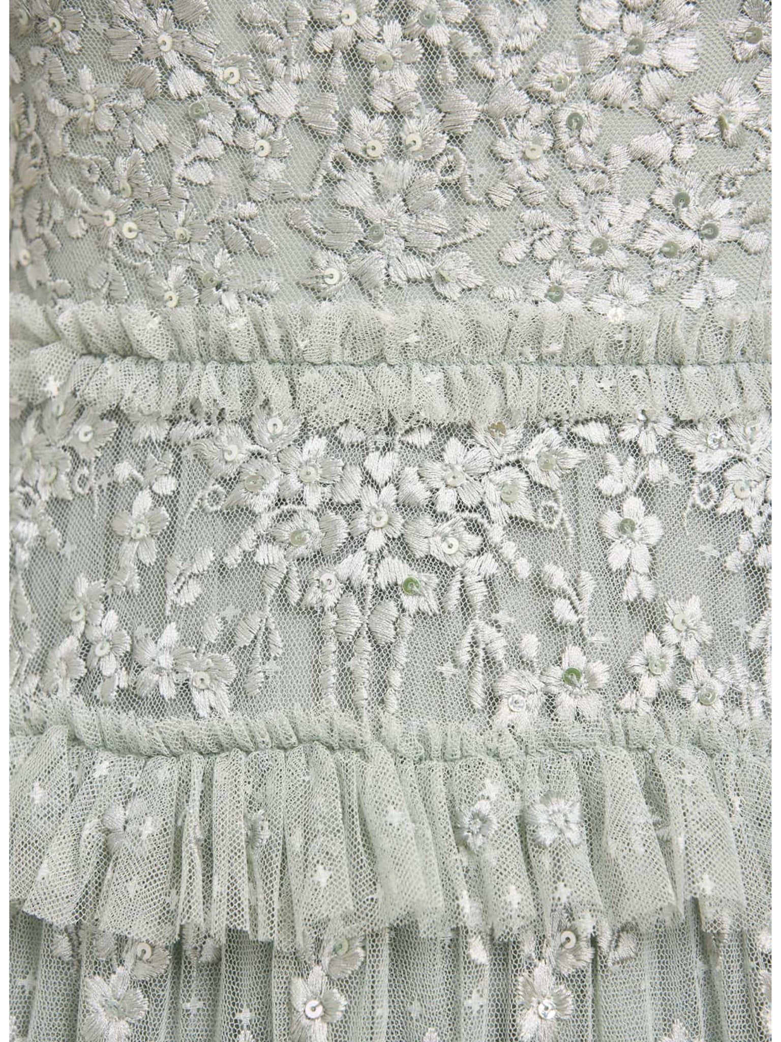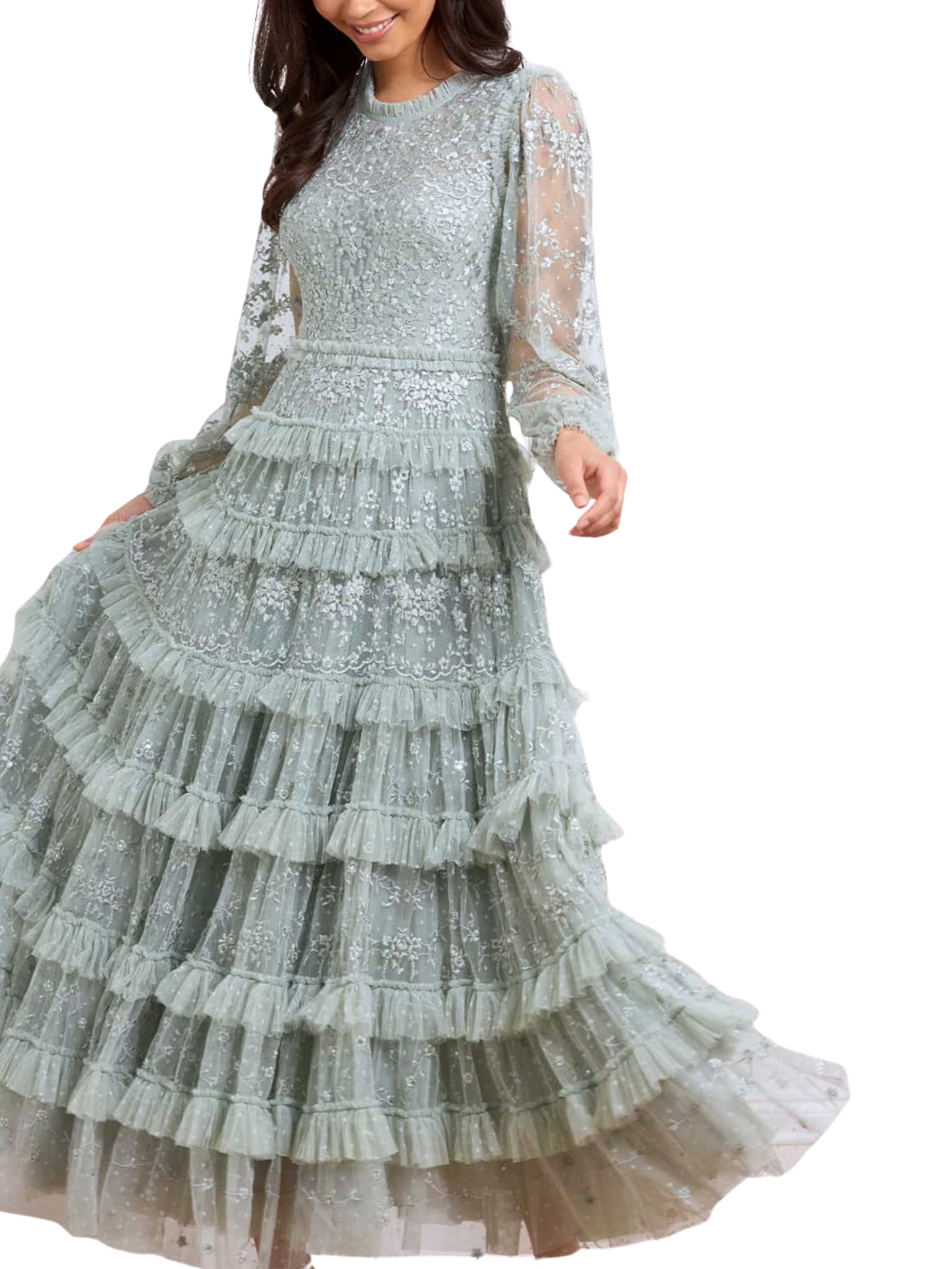 Step into timeless sophistication with the Blossom Lace Ankle Gown by Needle & Thread. Made from 100% recycled polyester kisses tulle, this gown features delicate lace floral embellishments on an ankle-length silhouette, combining eco-conscious craftsmanship with romantic elegance—perfect for weddings, formal events, and special occasions in Riyadh, Jeddah, and across Saudi Arabia.