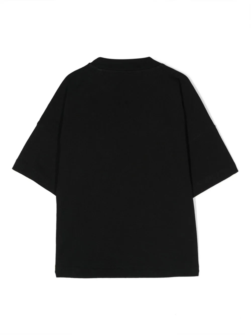قميص بأكمام قصيرة بلون أسود بتصميم فضفاض يتميز بنخيل وأمواج وشعار "Palm Angels" مطبوعة بتأثير النيون على الجهة الأمامية.
