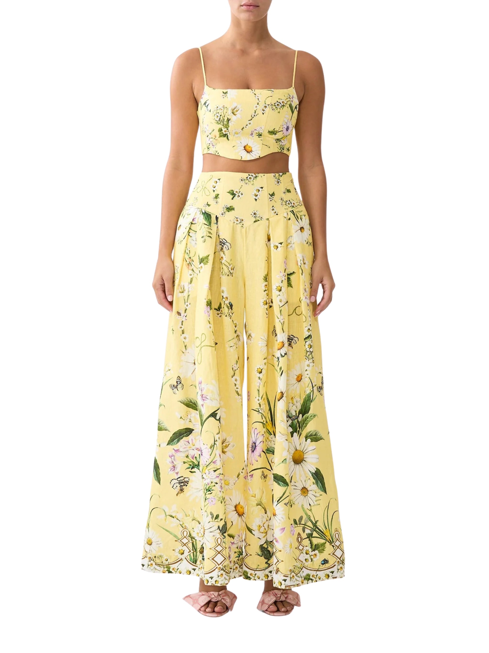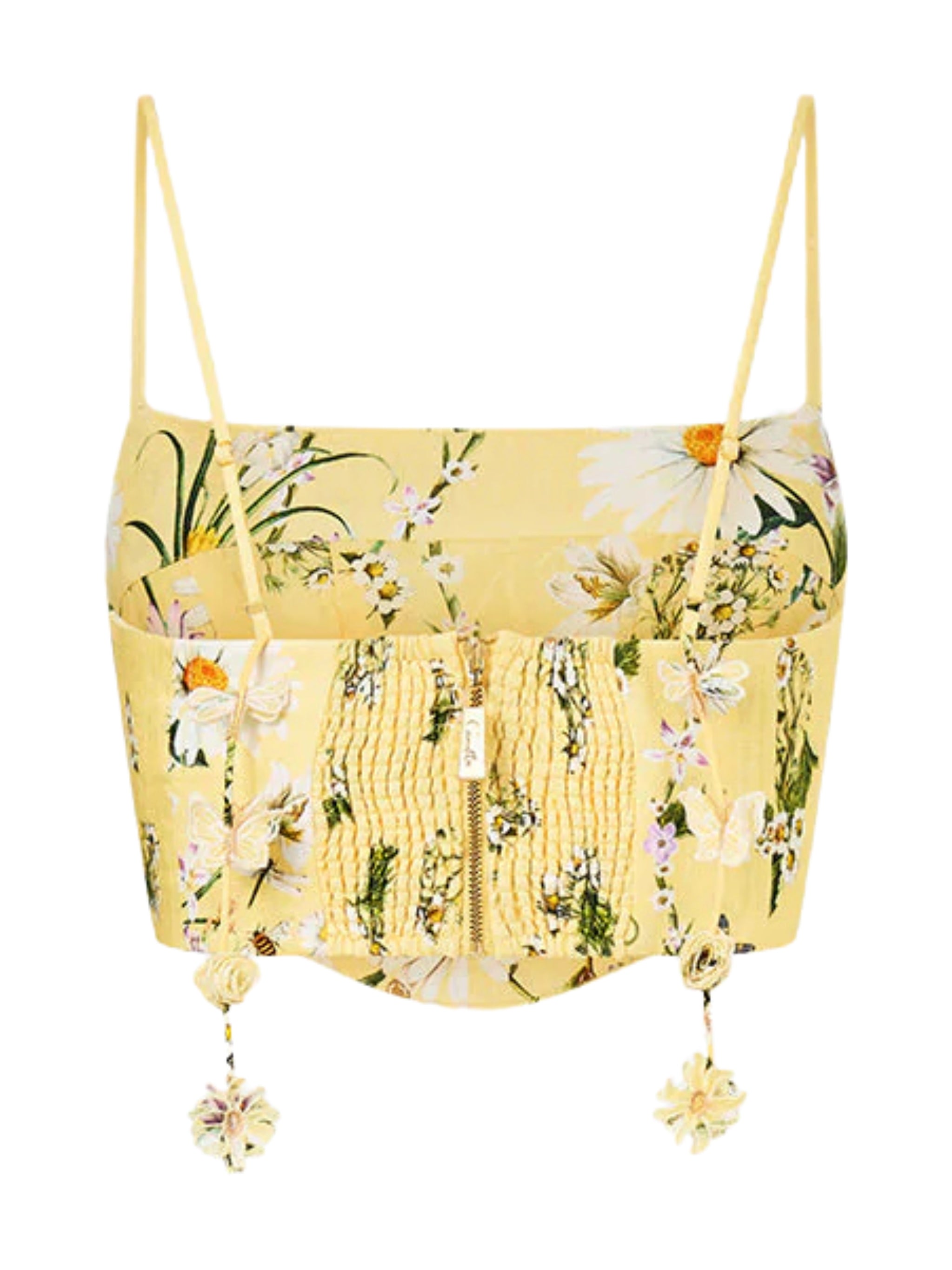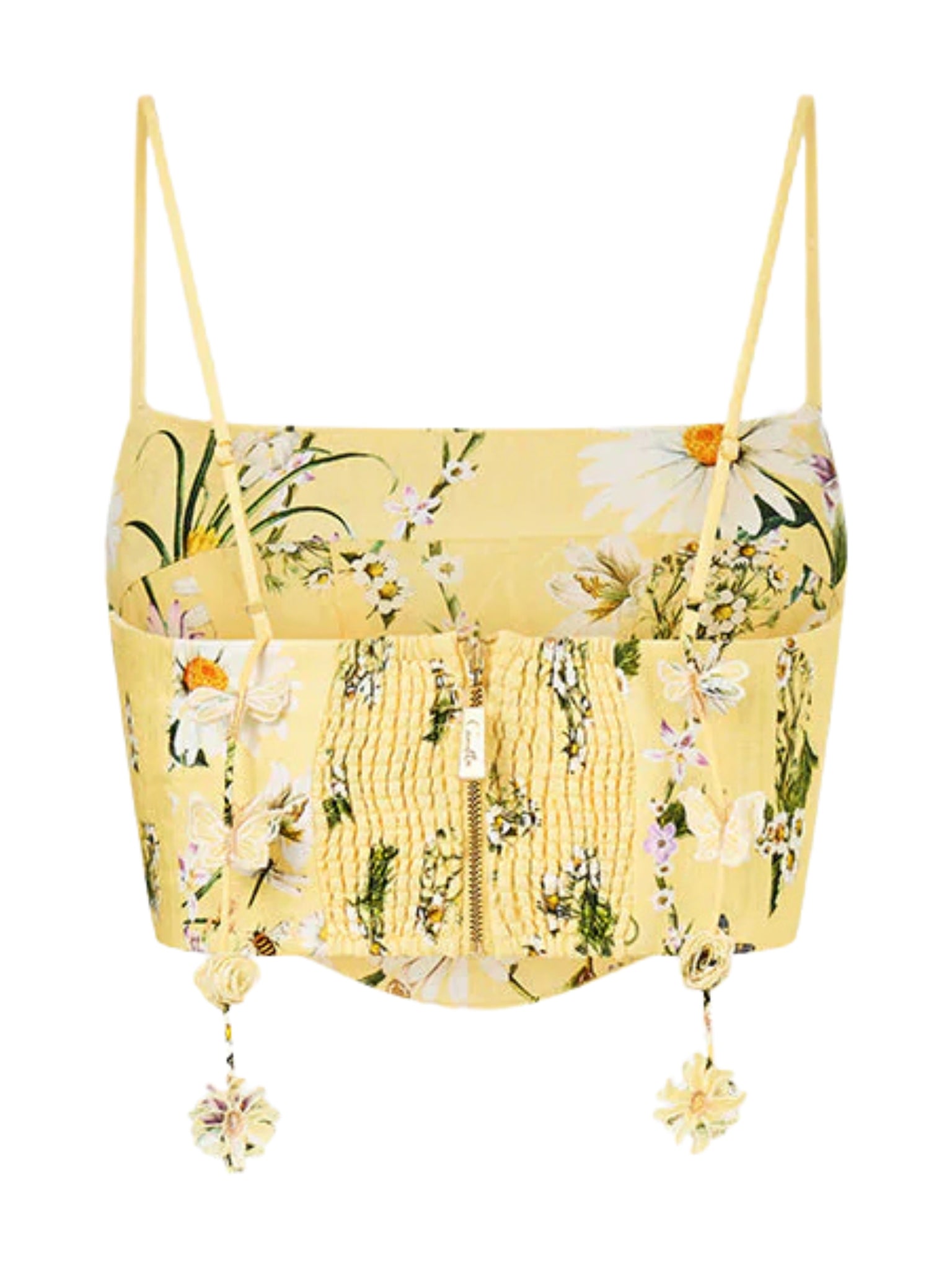 Inspired by sunlit meadows and golden days, the Daisy Chains Corset Crop Top by CAMILLA fuses bohemian charm with sculpted elegance. Handcrafted from breathable flax-based linen, this structured top features daisy florals and vintage-inspired botanical motifs—an effortless expression of modern femininity with heritage detailing.