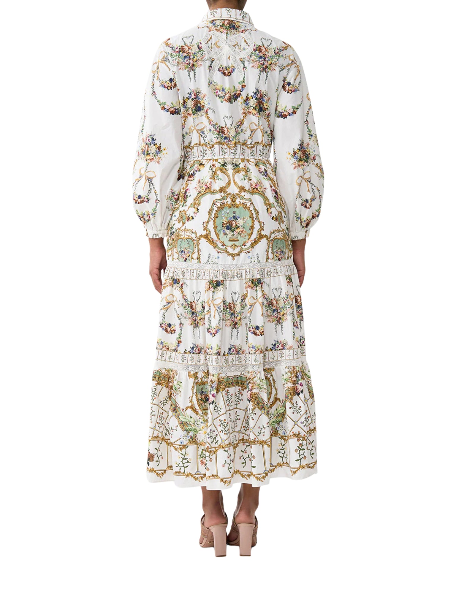 A regal nod to the lavish dressing chambers of European royalty, the Dressing Room Drama Tiered Long Shirt Dress by CAMILLA is an exquisite blend of bold femininity and timeless sophistication. Set on a rich black canvas, adorned with florals and golden arches, this statement piece flows into a tiered maxi silhouette that flatters effortlessly.