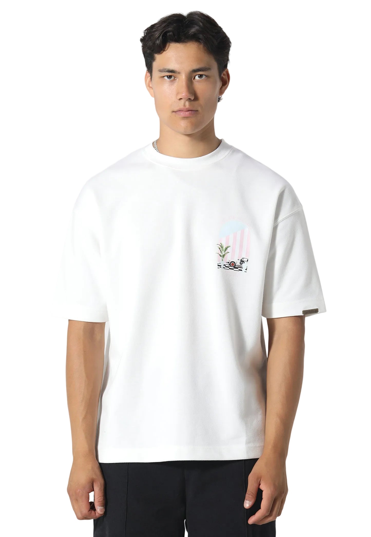 Pastel tones with race-inspired scenery for a retro lounge aesthetic