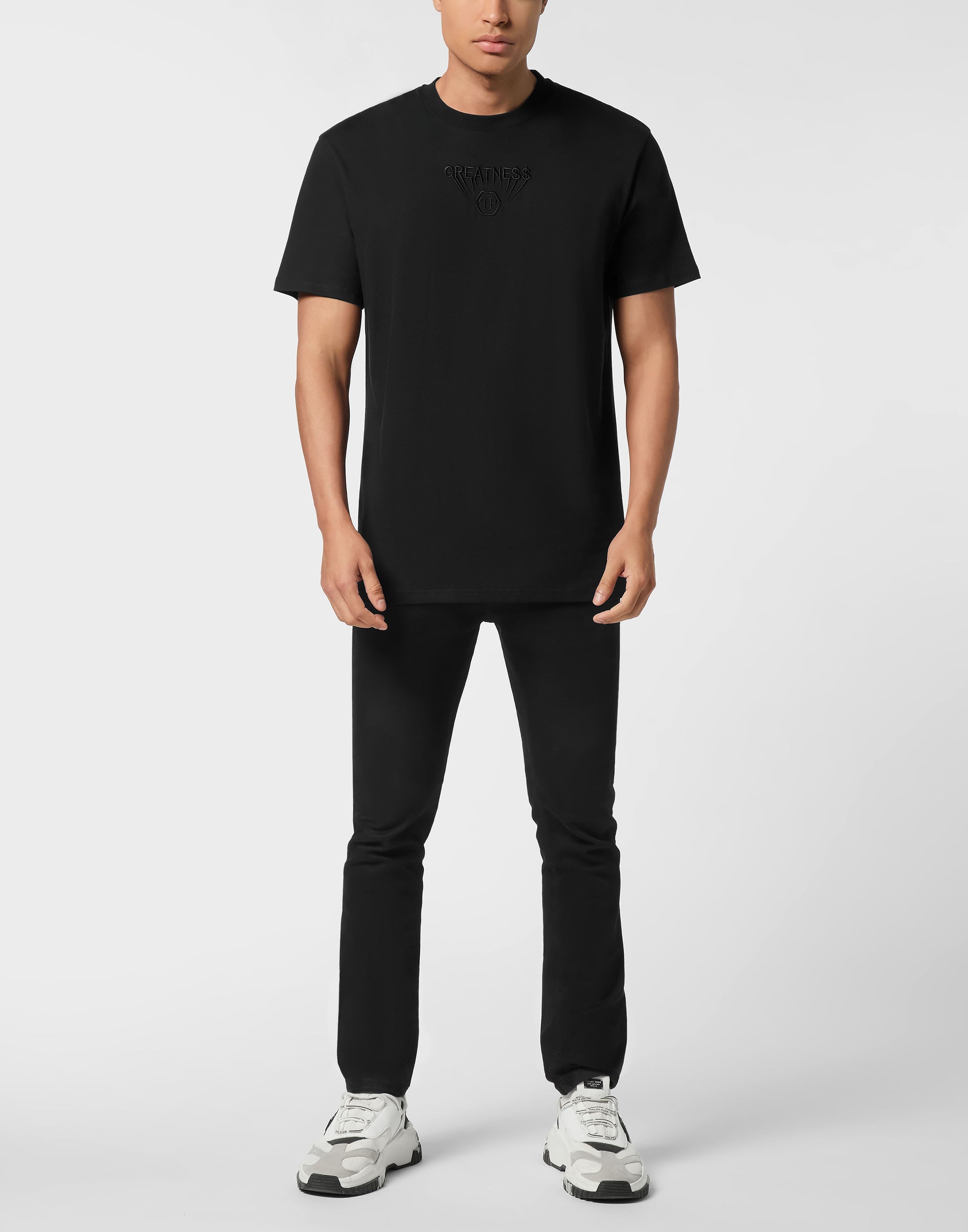 Make a bold statement with the Philipp Plein Round Neck T-Shirt Greatness in classic black. Blending comfort with signature designer details, this essential wardrobe piece is perfect for casual and elevated everyday looks.