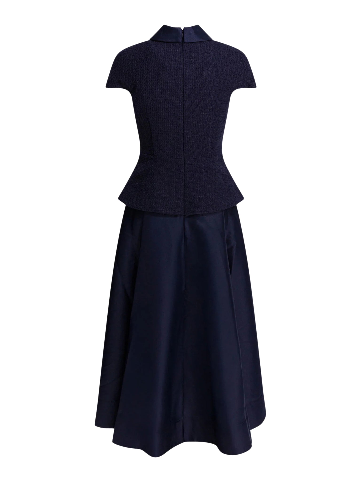 NAVY BOUCLÉ TAFFETA MIDI DRESS