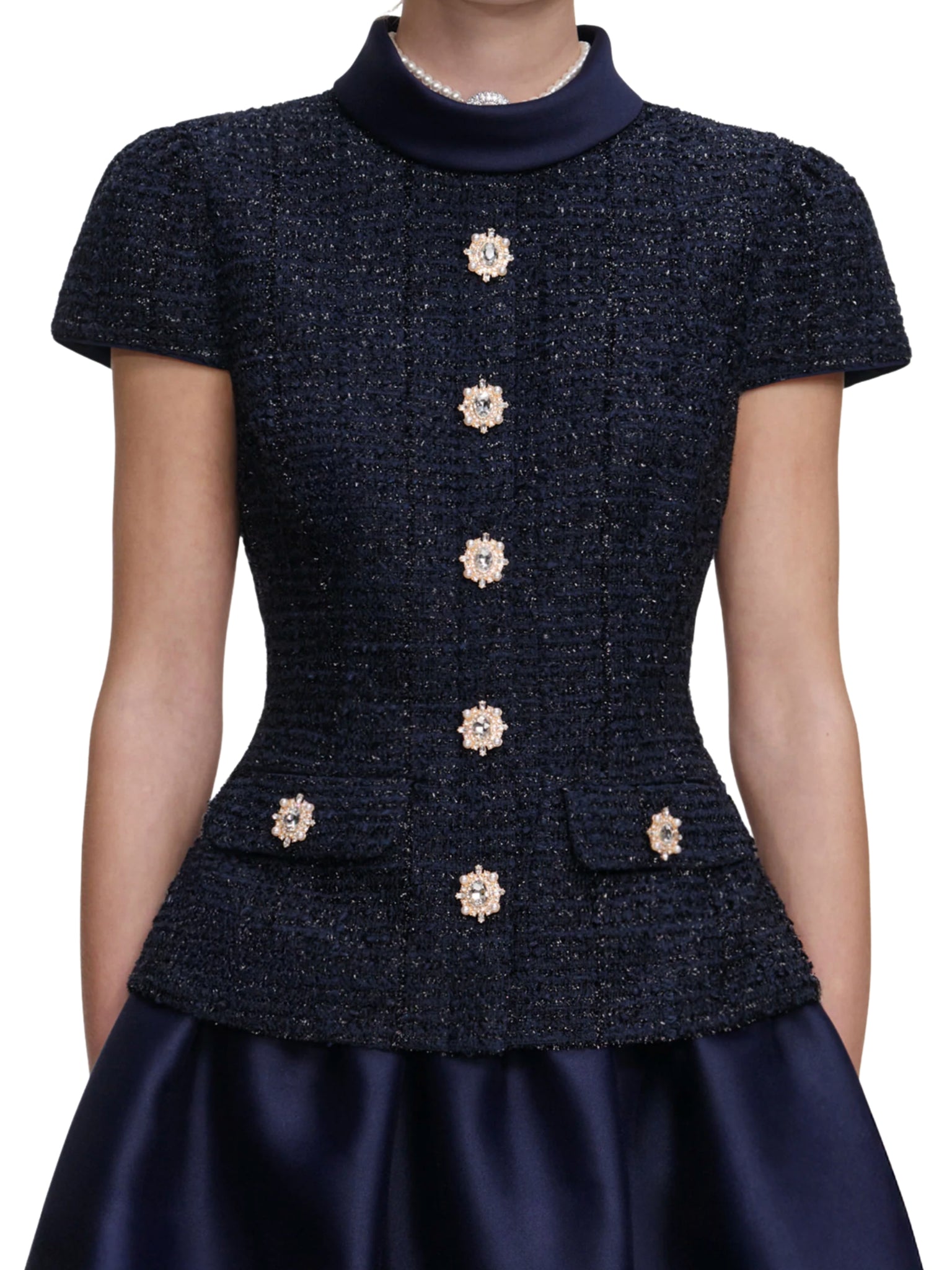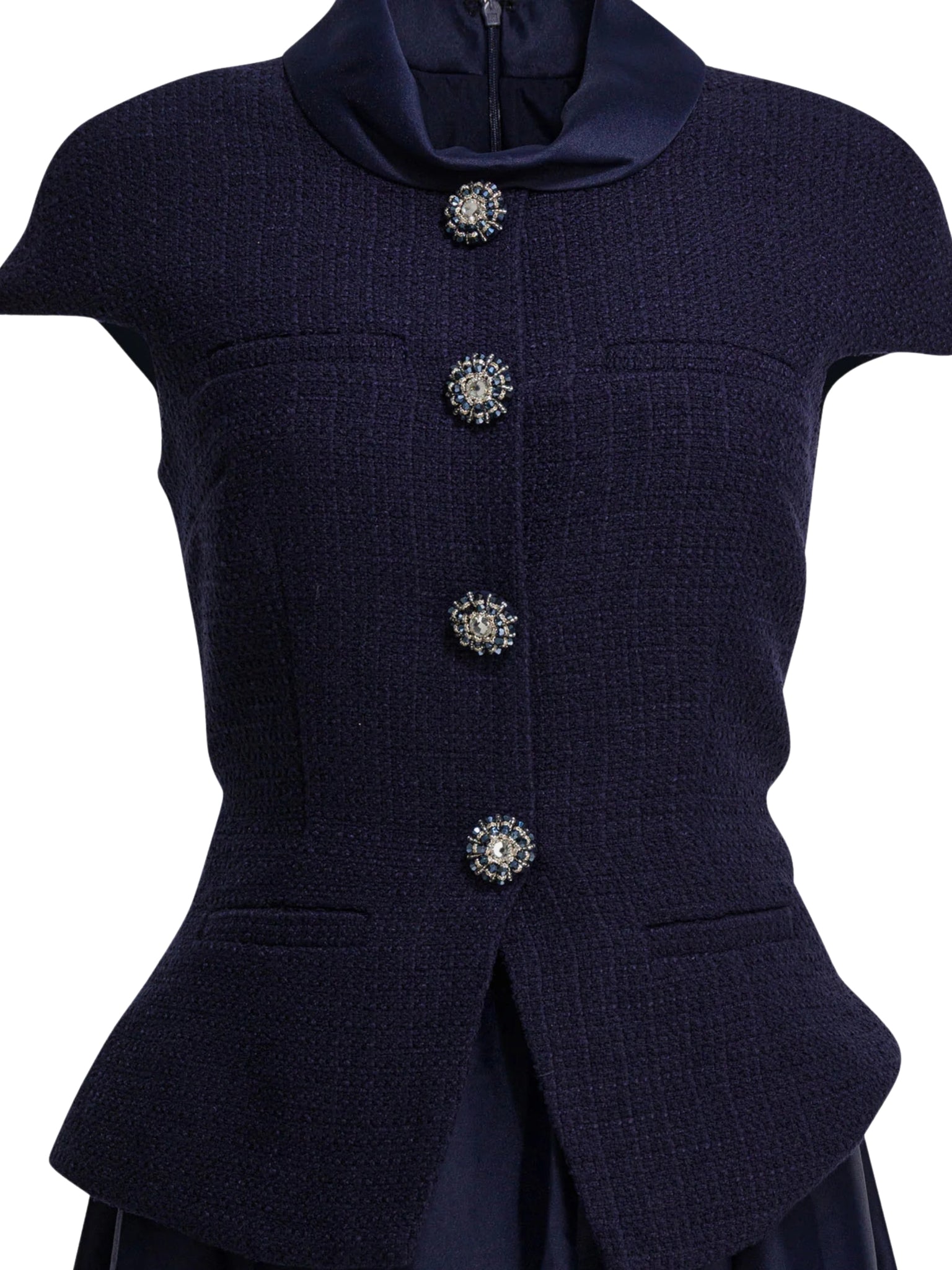 Navy bouclé bodice with taffeta skirt for texture and elegant sheen