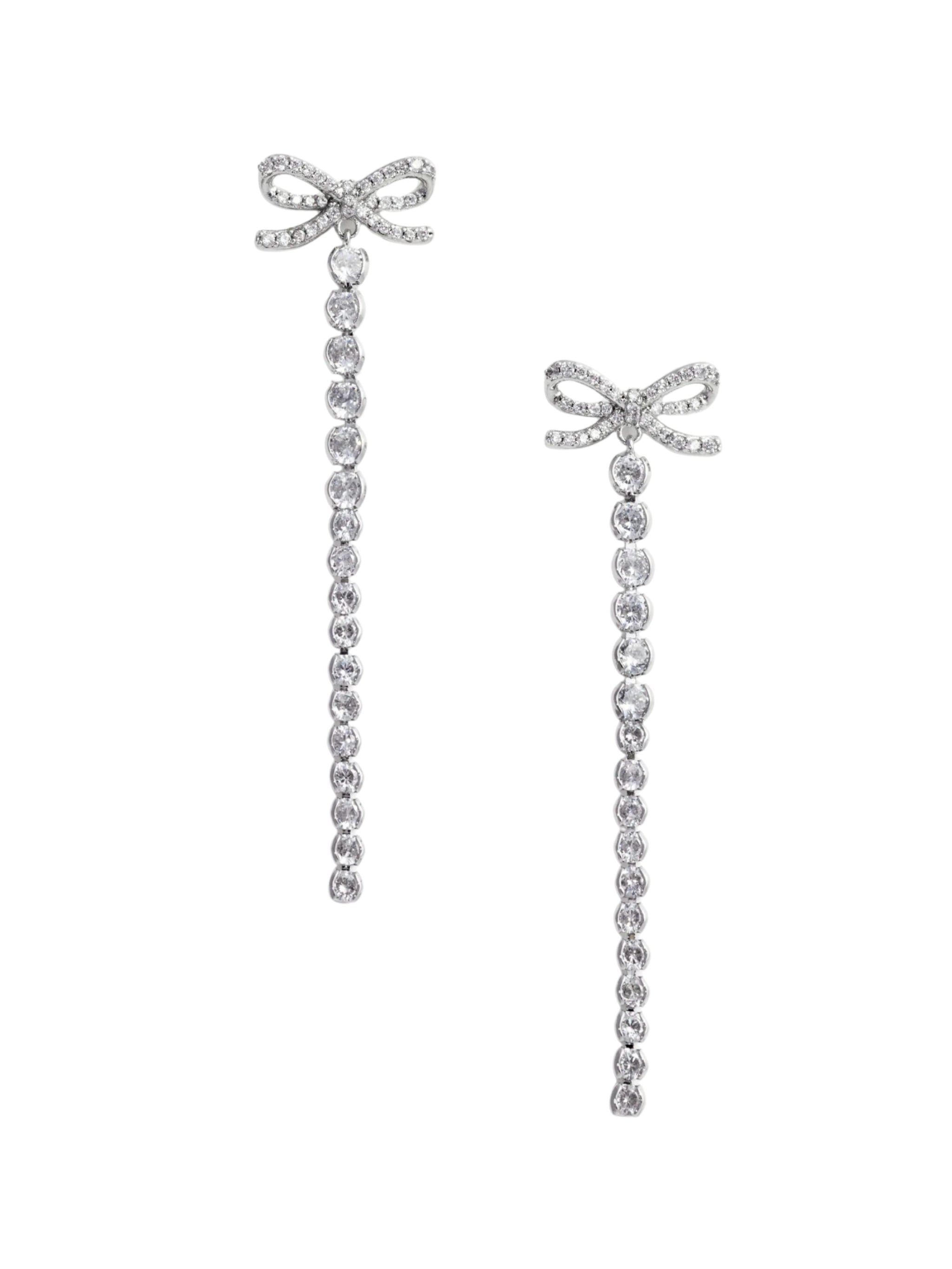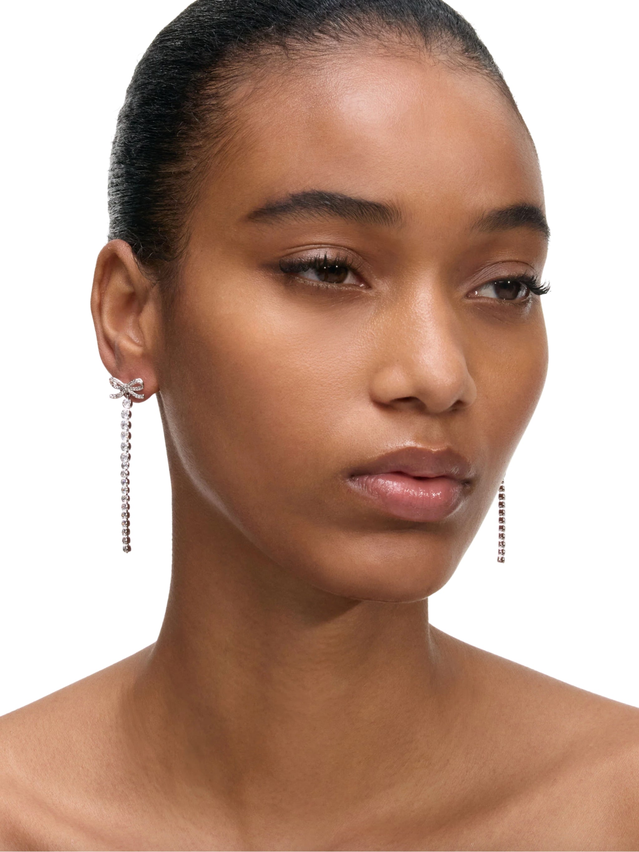 Frame your face with sparkling elegance with these SELF PORTRAIT silver crystal bow droplet earrings. Perfect for elevating any outfit, they pair beautifully with eveningwear or statement accessories for a fully accessorised luxury look.