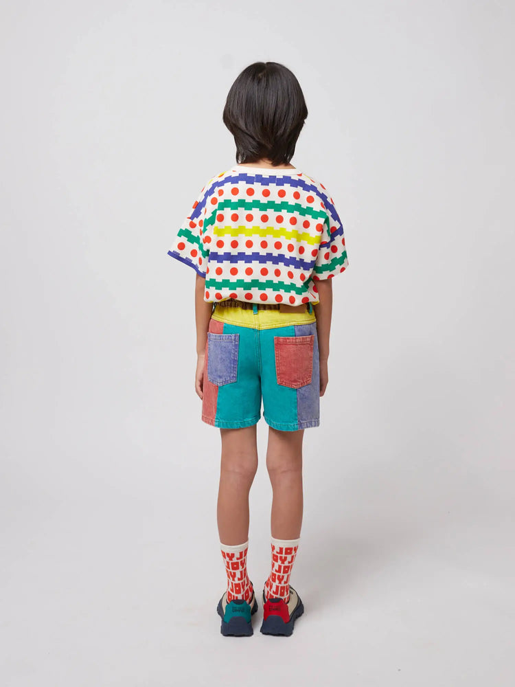 Bold, durable, and made for play. These Color Block Denim Shorts bring energy to everyday wear with their vibrant multicolor design and classic denim construction. Crafted from 100% organic cotton, they offer breathable comfort and lasting quality. Functional details like the adjustable waistband, front button fastening, and belt loops ensure a secure and customizable fit. With an over-the-knee length, patch pockets, and a structured silhouette, these shorts are perfect for active kids with a creative spirit. Proudly made in Portugal with sustainable practices.