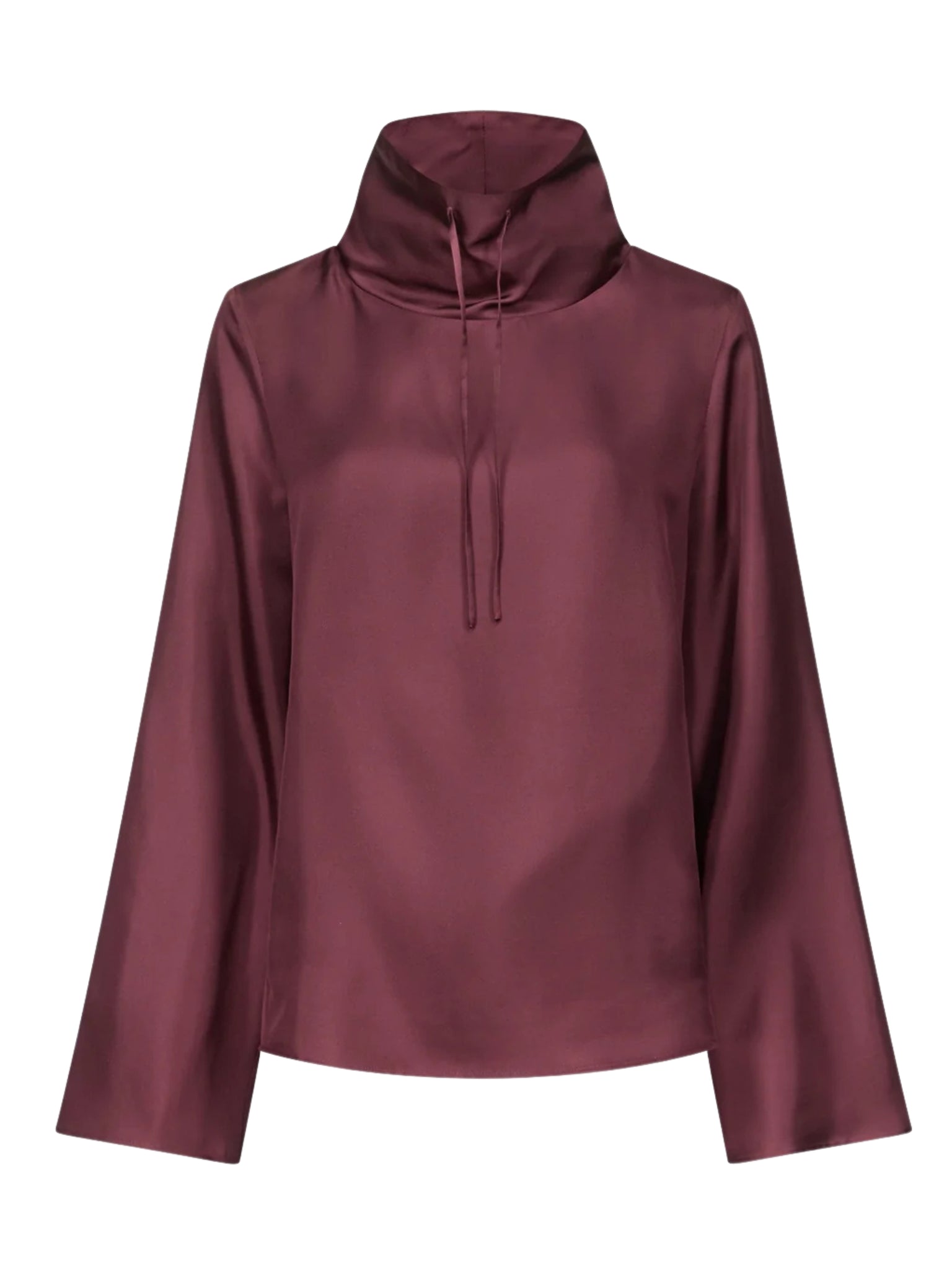 • Stand collar with drawstring detailing that drapes softly around the neckline