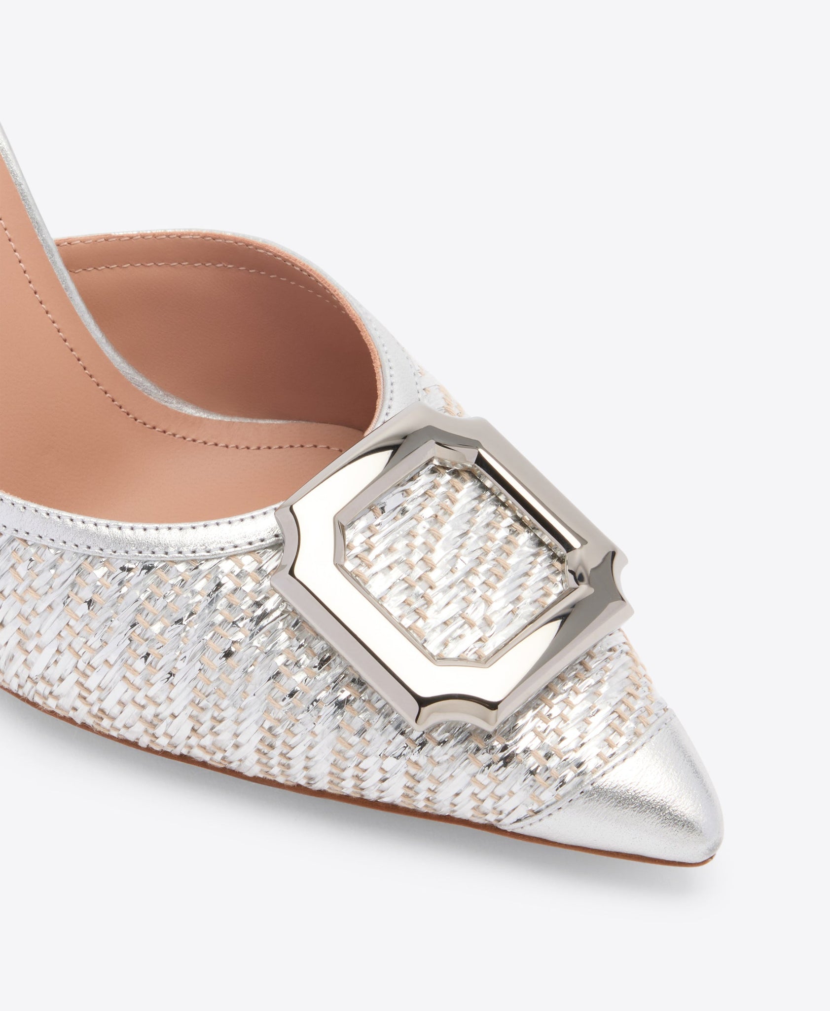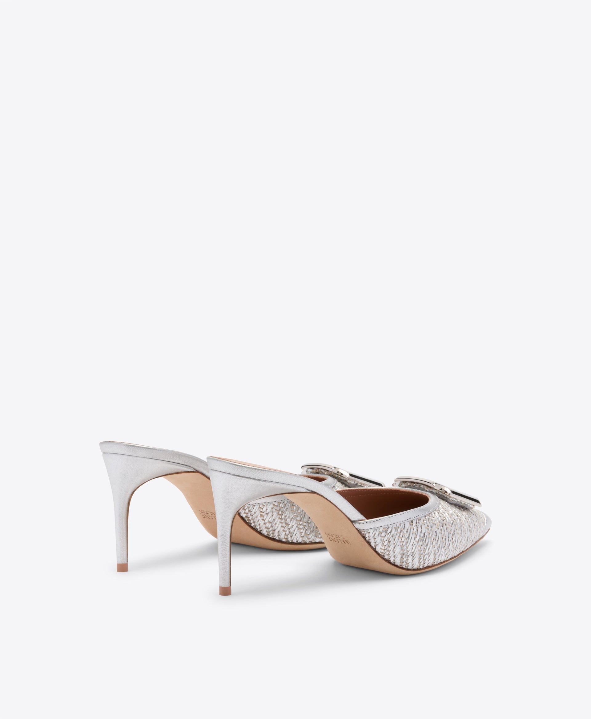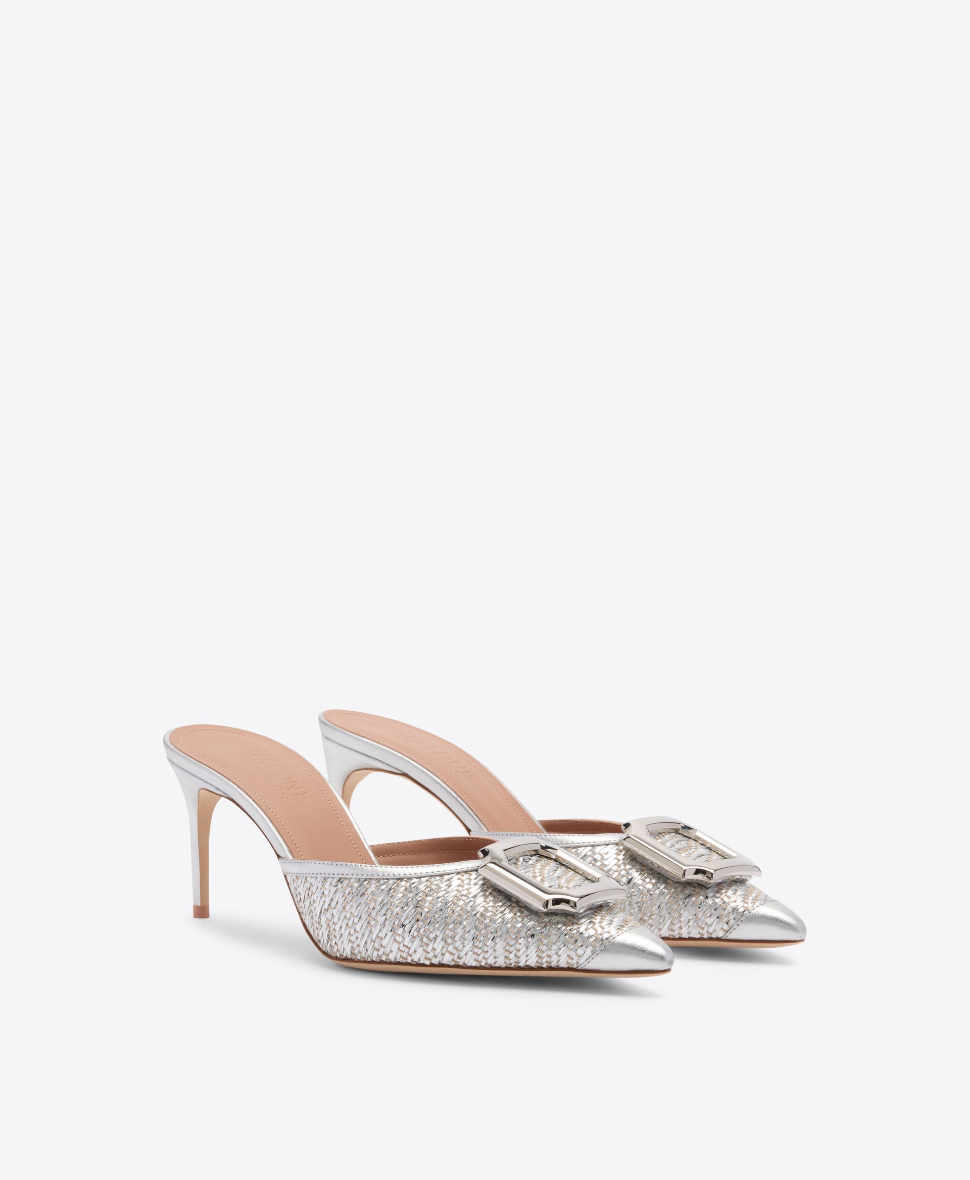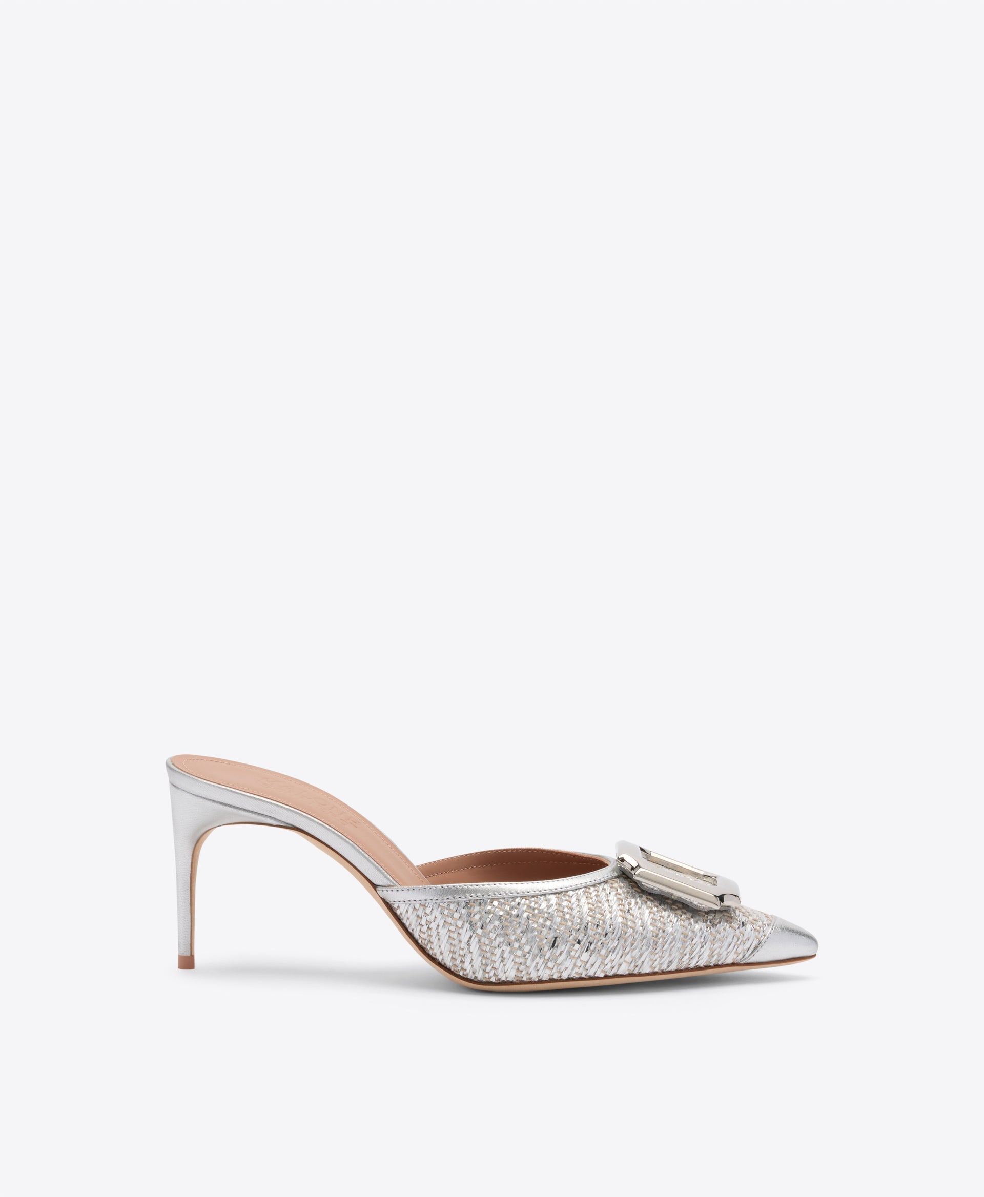 A moment of silver sophistication, the Mona mule is crafted to shine. Made in Italy from metallic raffia with smooth tonal Nappa trims, this pointed-toe silhouette is elevated with the brand’s iconic crest buckle. Set on a sleek 70mm stiletto heel, Mona is elegant, modern, and designed to light up every occasion.