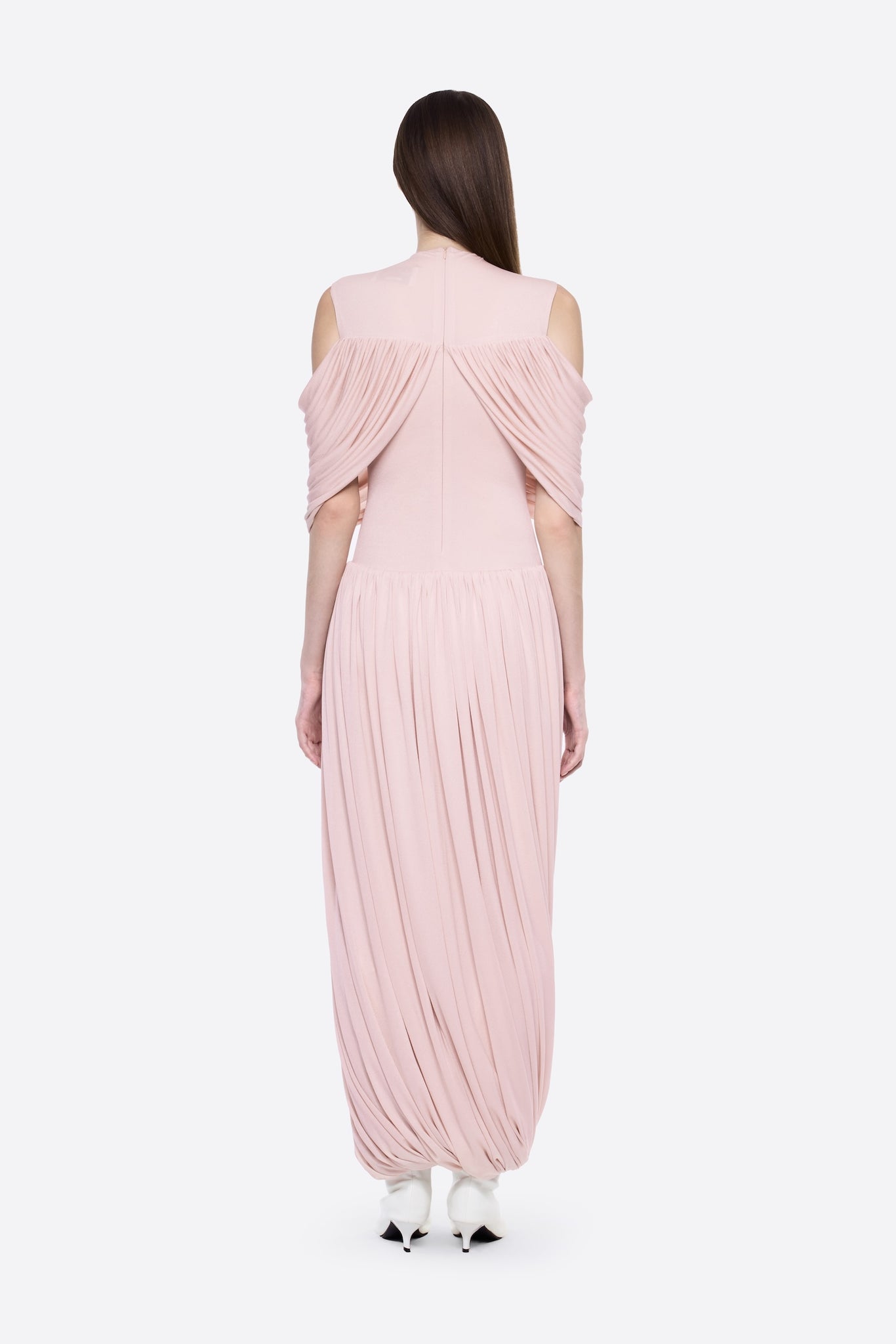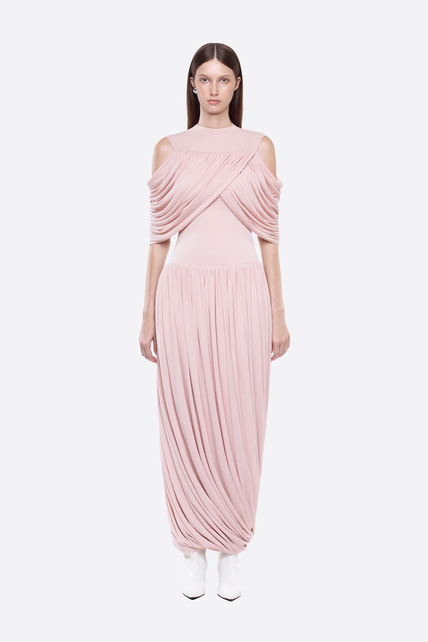 Graceful yet contemporary, the Ethel Dress is designed to stand out through fluid movement and sculptural elegance. Finished in a soft pink hue, this long, form-fitting silhouette blends artistic draping with modern detailing ideal for refined evening occasions in Saudi Arabia.