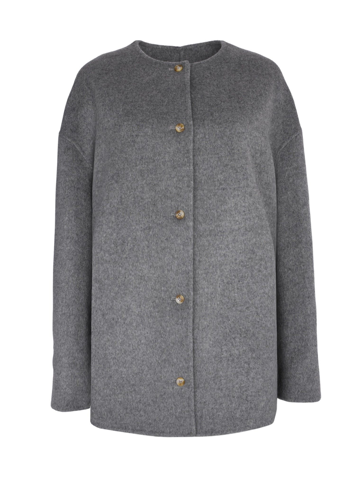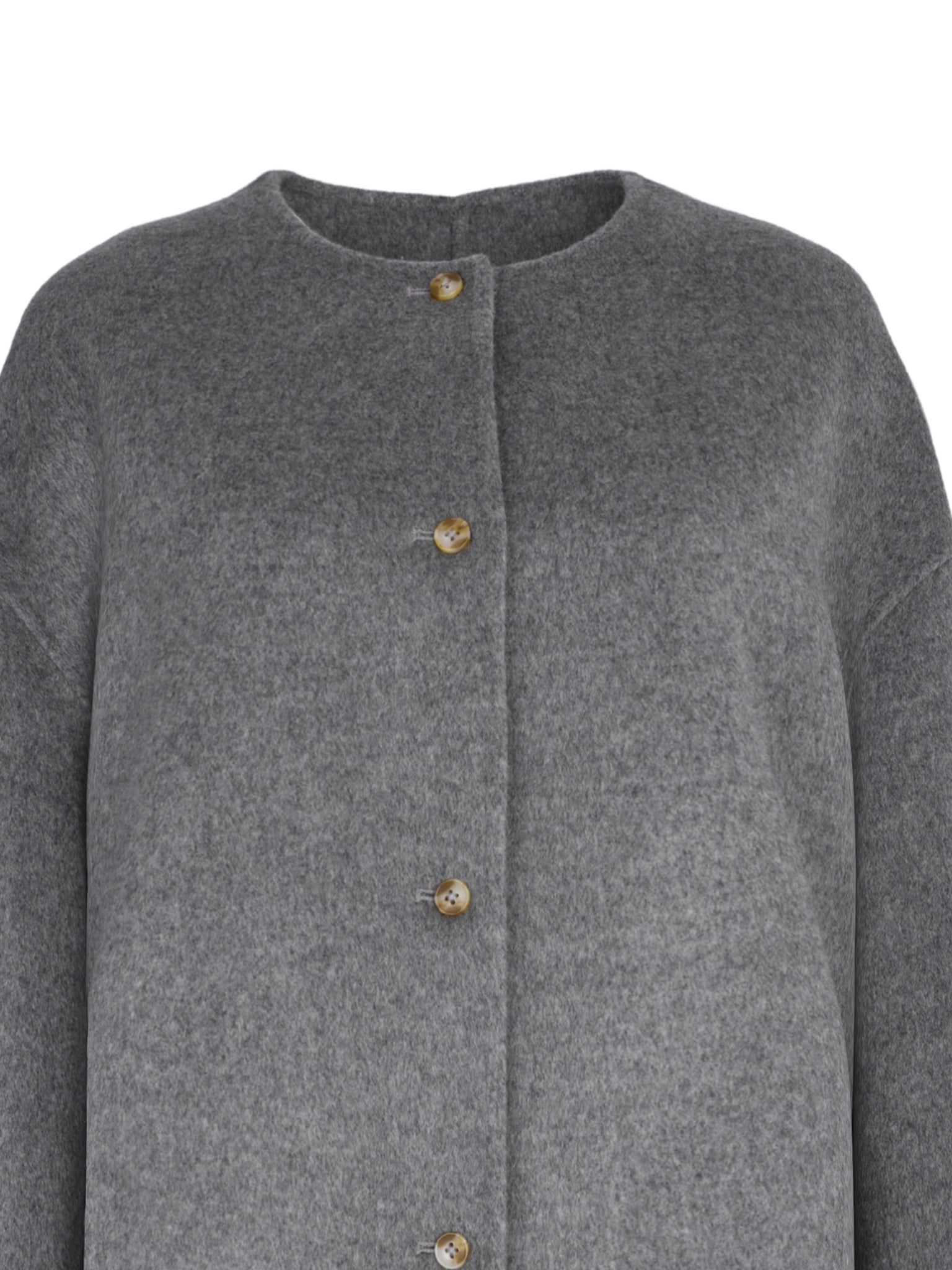 Designed for modern elegance, this short coat by Loulou de Saison embodies understated luxury. Crafted from a soft wool-cashmere blend, it features a clean, straight fit and a minimalist single-breasted front. The collarless crew neckline and dropped shoulders lend a contemporary edge, making it a versatile layer for cooler evenings in Riyadh or breezy moments in Jeddah.