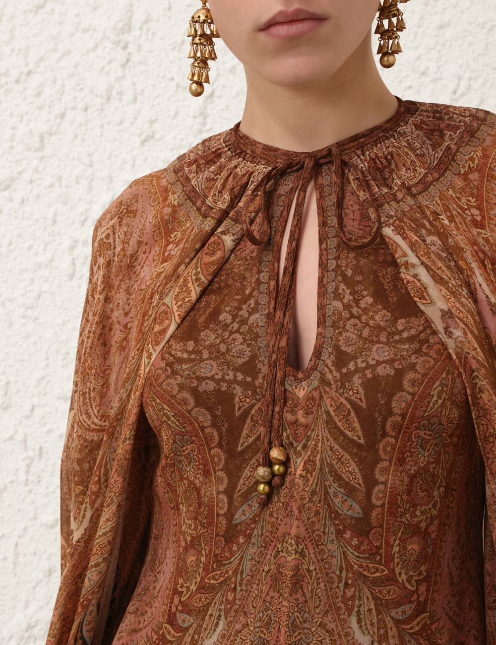 A modern take on timeless drama the Hypnotic Caped Maxi Dress by Zimmermann blends regal charm with fluid femininity. Designed in a rich black paisley print, this statement piece features a detachable cape, creating graceful movement with every step an ideal choice for elevated gatherings in Jeddah, Riyadh, or any evening affair.