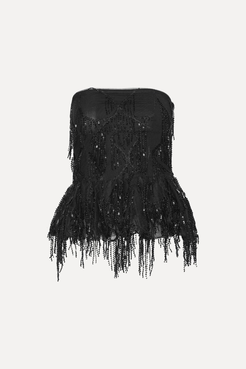 Radiate confidence and glamour with this strapless sequined bubble top in timeless black. Crafted with a fitted silhouette and a voluminous flared hem, it catches every light with its delicate beaded fringe — a perfect choice for elevated evening looks and festive occasions in Saudi Arabia.