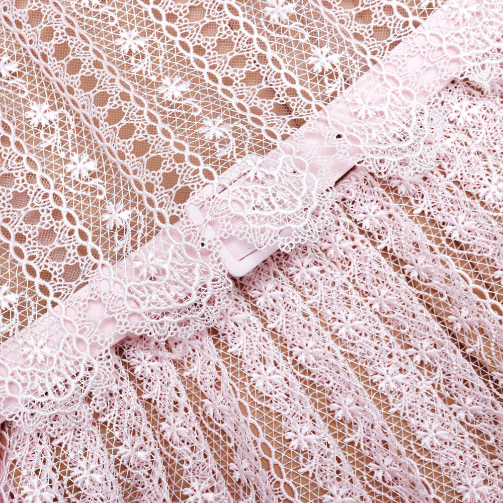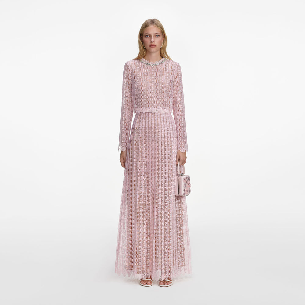 Ethereal elegance defines this pink organza lace maxi dress by SELF PORTRAIT. Striped floral lace, a tonal belt, and sparkling diamanté trims around the neckline create a romantic, flattering silhouette perfect for formal occasions or evening events.