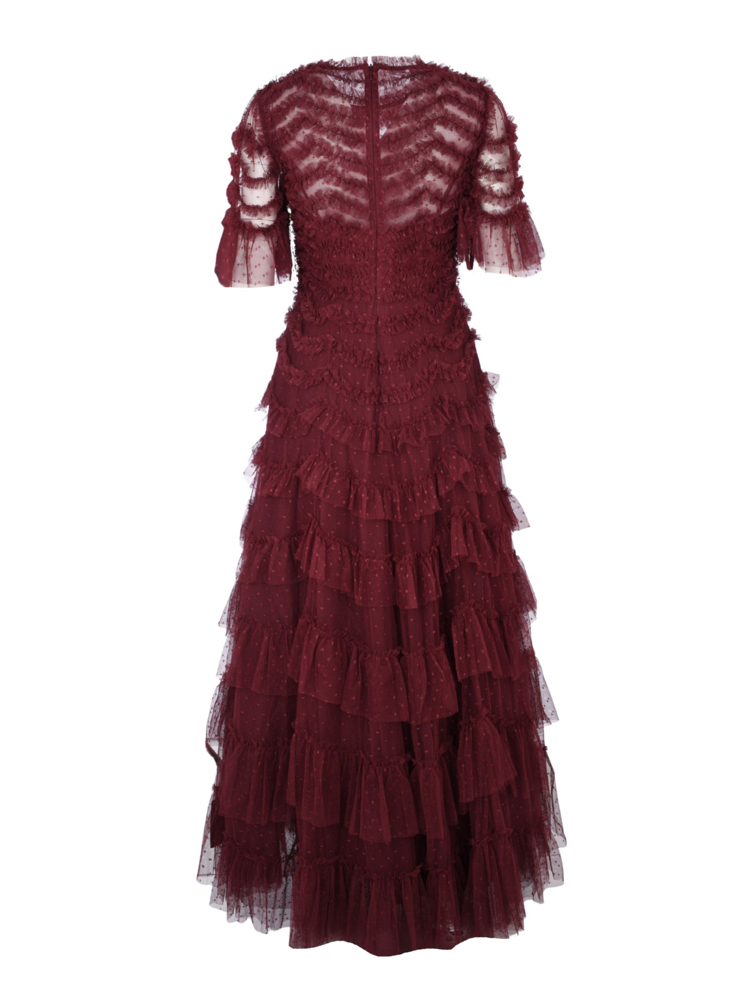The Aviana Short Sleeve Gown in Claret radiates timeless elegance with a touch of modern romance. Crafted in delicate tulle and adorned with signature scalloped frills, this gown flows gracefully with every movement. The rich claret hue enhances its sophisticated allure, making it a perfect choice for evening occasions and celebrations.