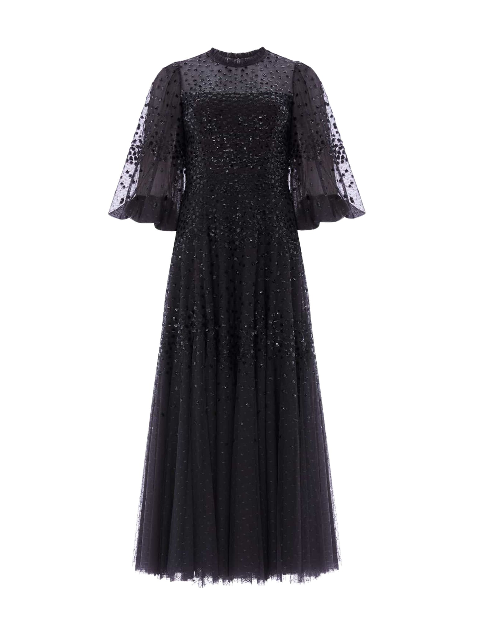 The Scallop Sequin Round Neck Ankle Gown in Graphite offers a contemporary take on timeless romance. Crafted from delicate tulle, the gown features scallop-shaped sequin clusters that shimmer across a slim bodice and ankle-length skirt. The graphite hue enhances its moody sophistication, creating an elegant choice for refined soirées and evening occasions.