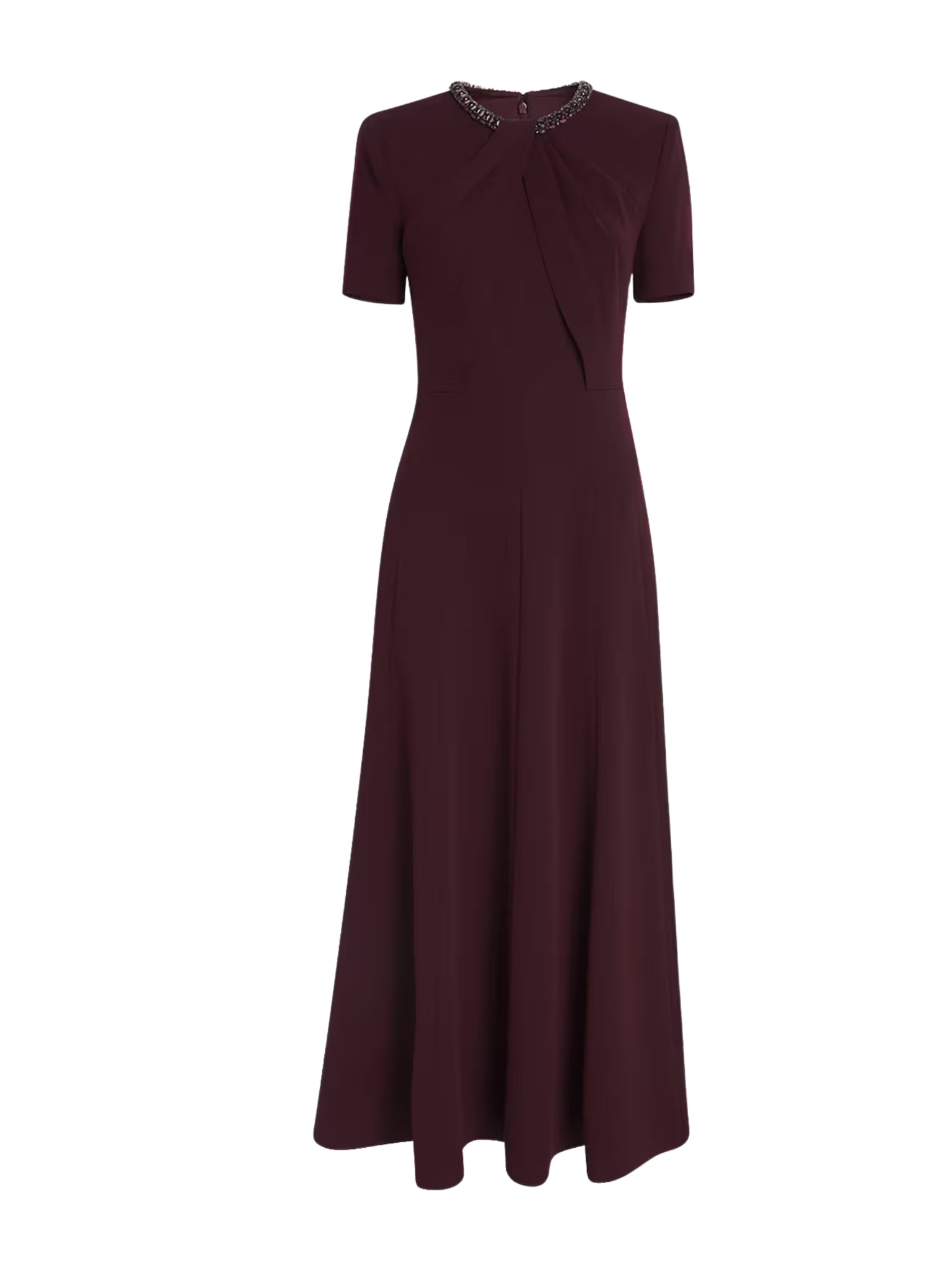 Graceful and refined, the Twisted Drape Crystal Trim Neckline Dress by Roland Mouret in deep Mulberry blends soft structure with elegant movement. Crafted in luxurious light cady, this short-sleeve dress features a crystal-trimmed twisted neckline and a full skirt, creating a sophisticated statement ideal for elegant occasions in Saudi Arabia.