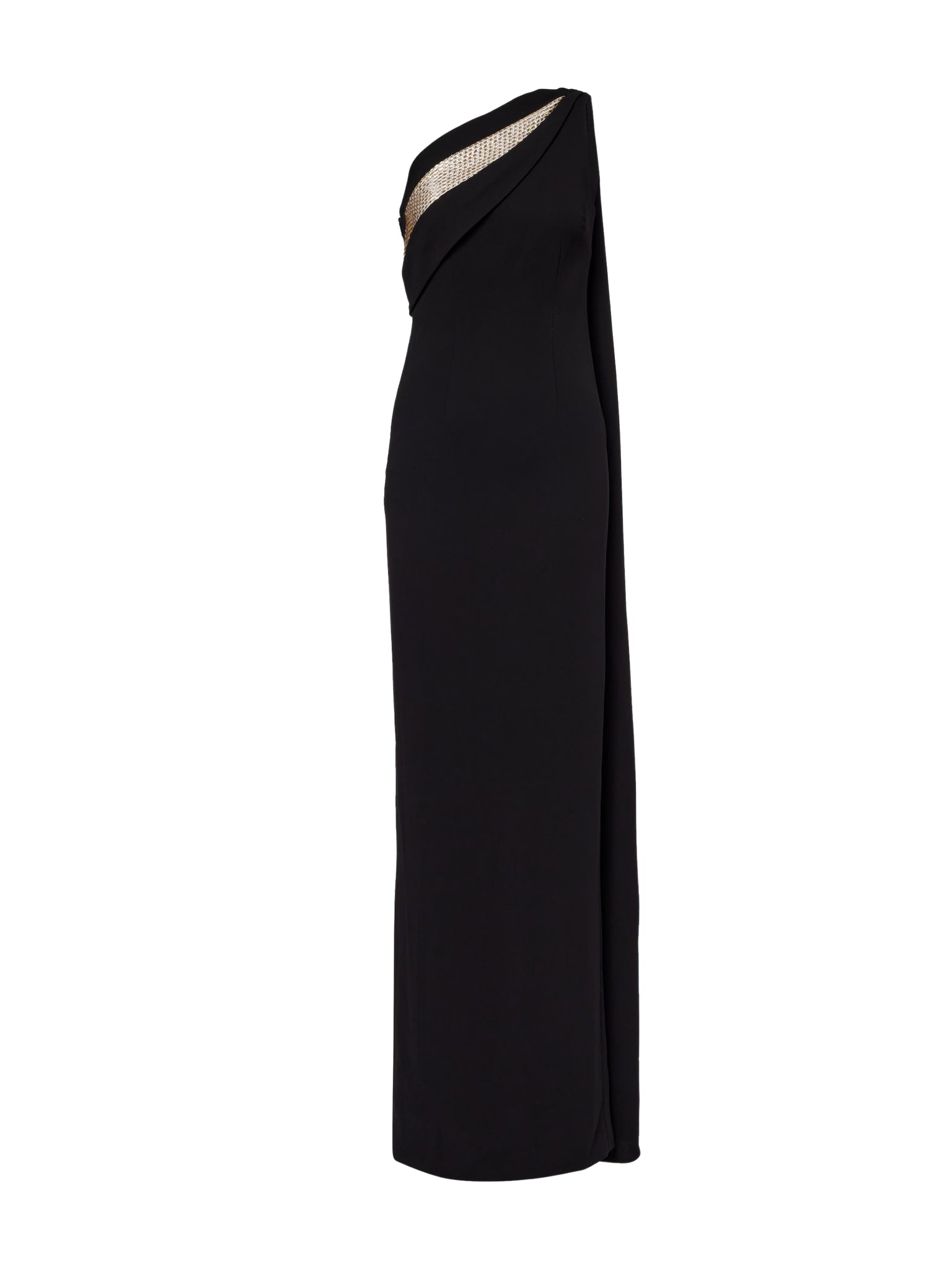 Turn heads in the One Shoulder Diamante Gown by Roland Mouret. This striking black gown features a single shoulder with a flowing drape at the back and a champagne-colored diamante panel at the chest, combining modern elegance with a touch of sparkle.