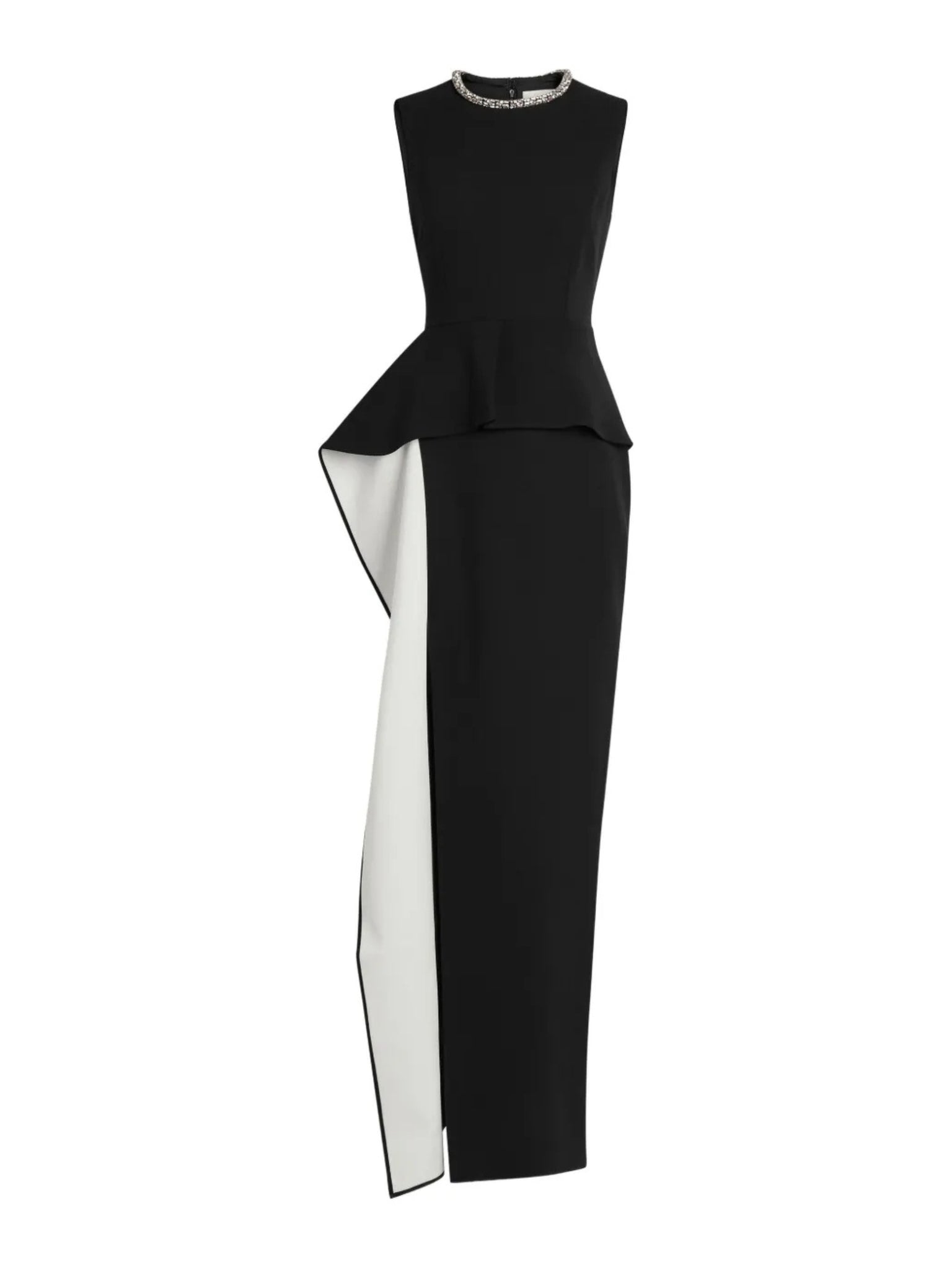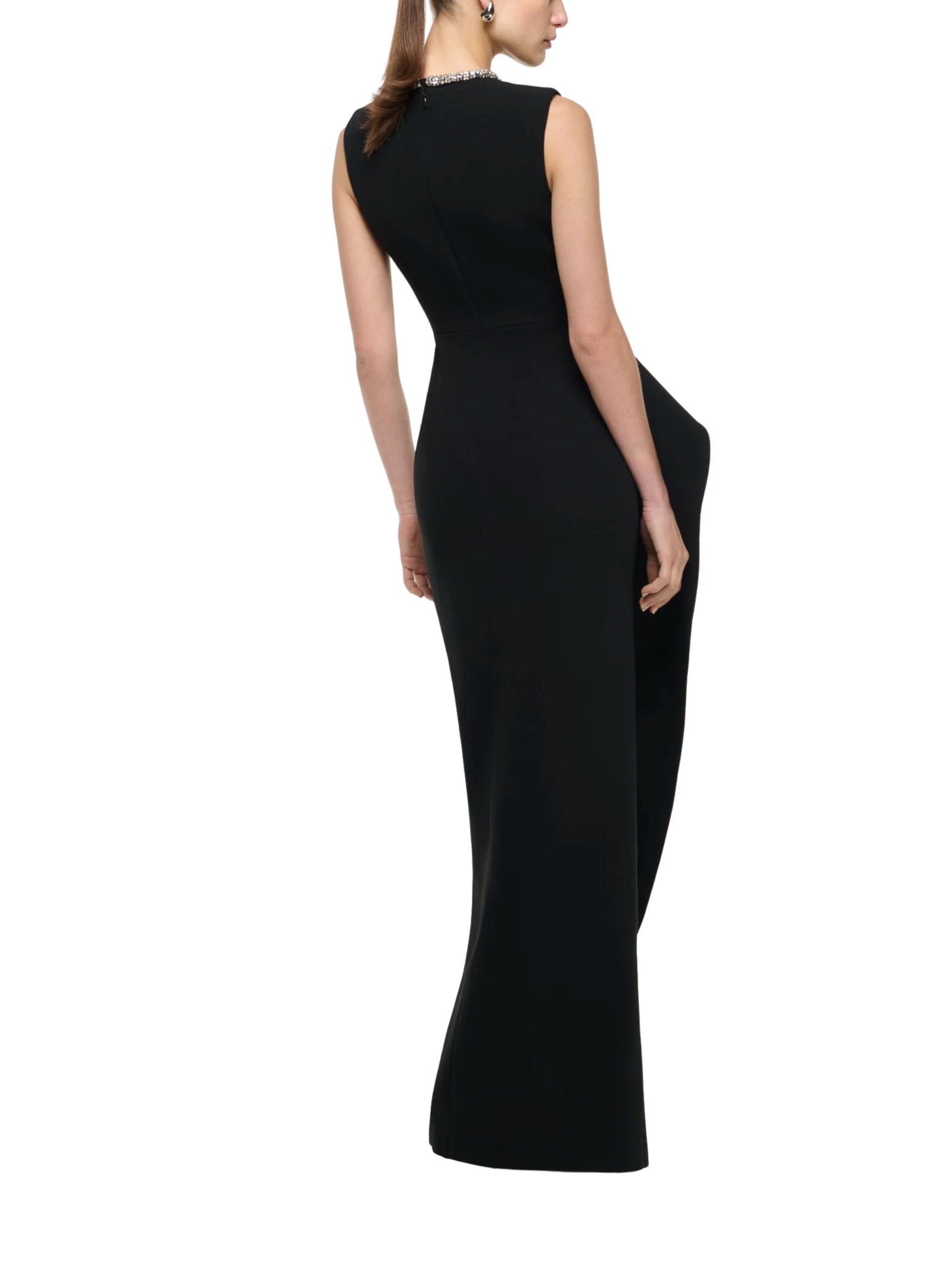Exude modern sophistication in the Waist Drape Gown by Roland Mouret. This sleeveless black satin crepe gown features a diamante-embellished neckline and a striking drape at the waist with a contrasting white reverse side, creating an elegant, sculptural silhouette.