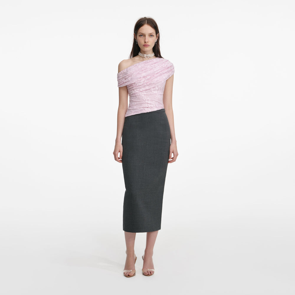 Designed for statement shine, this pink lace drape top features delicate floral motifs overlaid with sparkling rhinestone embellishments. An asymmetric neckline adds a modern twist, making it perfect to pair with denim or tailored separates for an elevated evening look.