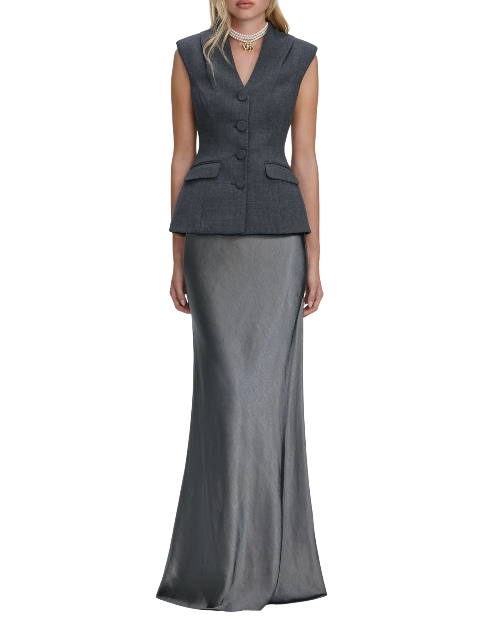 Elevate sophistication in this grey tailored satin maxi dress by SELF PORTRAIT. Combining tailored wool panels with the smooth shine of flowing satin, a chic peplum waist adds refined structure, making it perfect for black-tie events or elegant evening occasions.