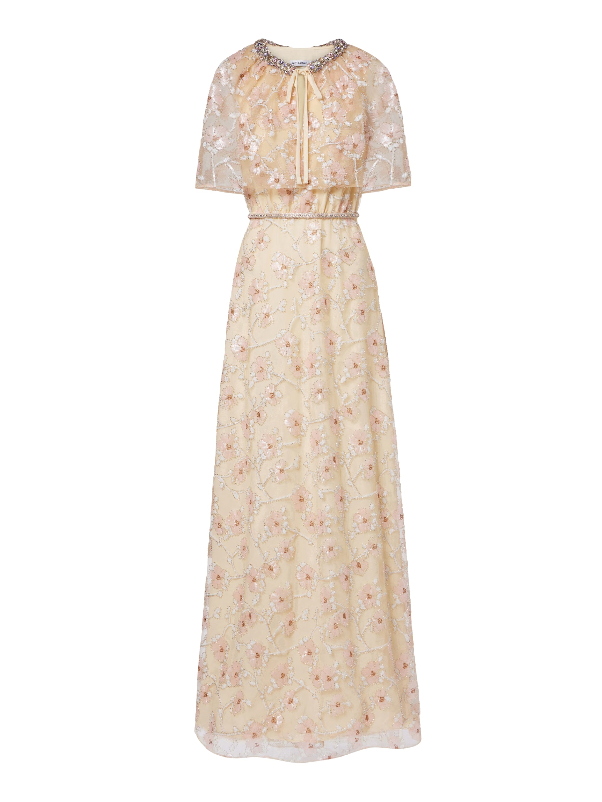 Radiating vintage-inspired elegance, this champagne floral embellished maxi dress by SELF PORTRAIT features a graceful cape detail and intricate beaded floral embroidery. Finished with sparkling trims at the neckline, it’s a statement piece designed for unforgettable occasions.