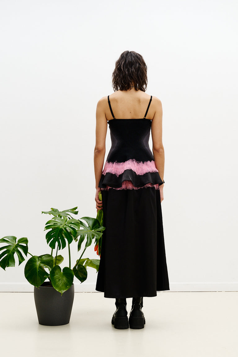 The Zinya Needle Punch Maxi Skirt embodies PH5’s Fall/Winter 2025 exploration of preservation, memory, and transformation. Crafted in signature jacquard knit, the design creates the illusion of layered garments, while needle-felted transitions seamlessly blend fabrications into one fluid silhouette—a metaphor for the intersection of past and future.