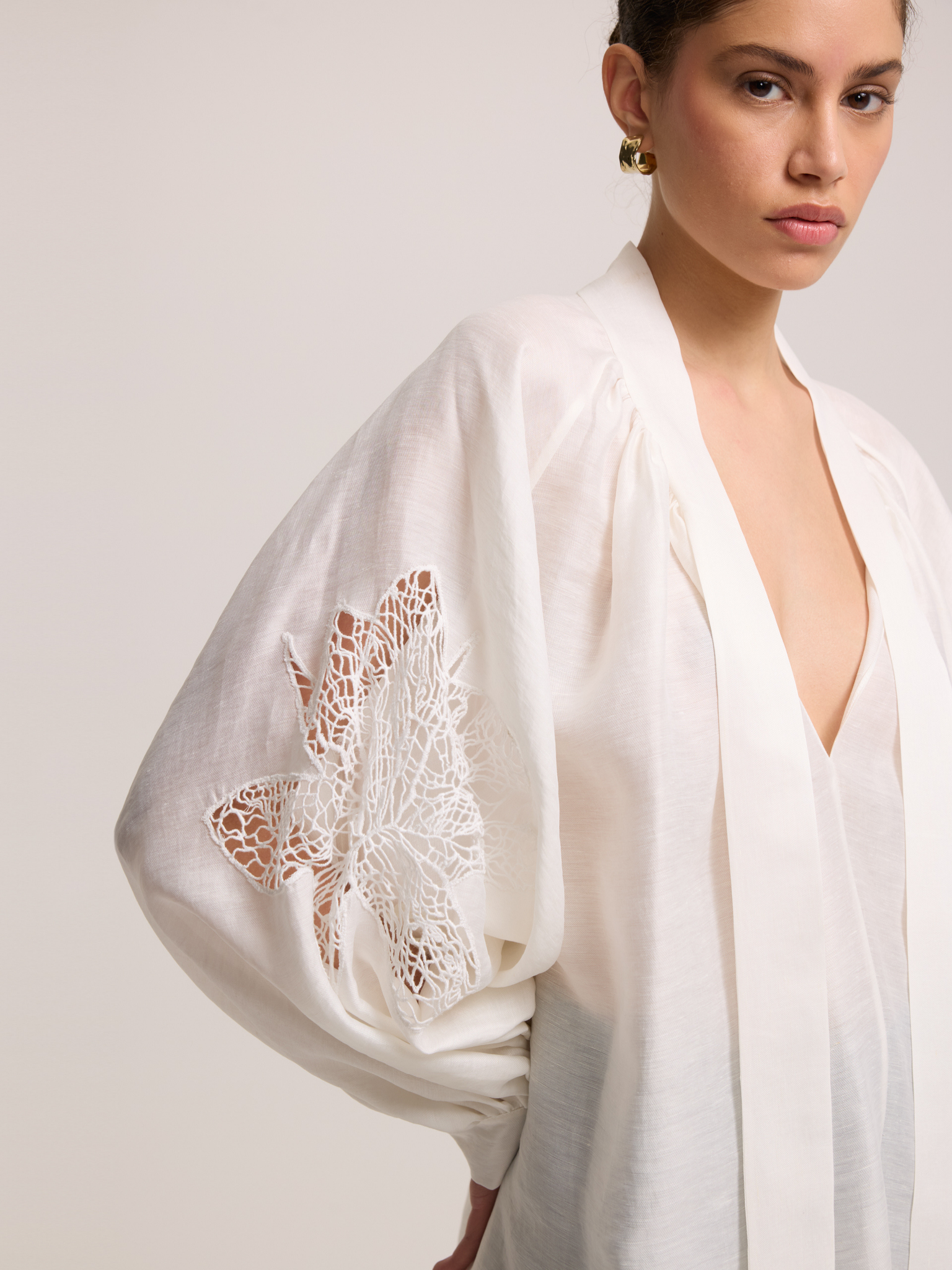 Versatile and effortlessly elegant, this white V-neck blouse features a shawl-inspired design and lace-embroidered sleeves — a wardrobe essential for timeless style.