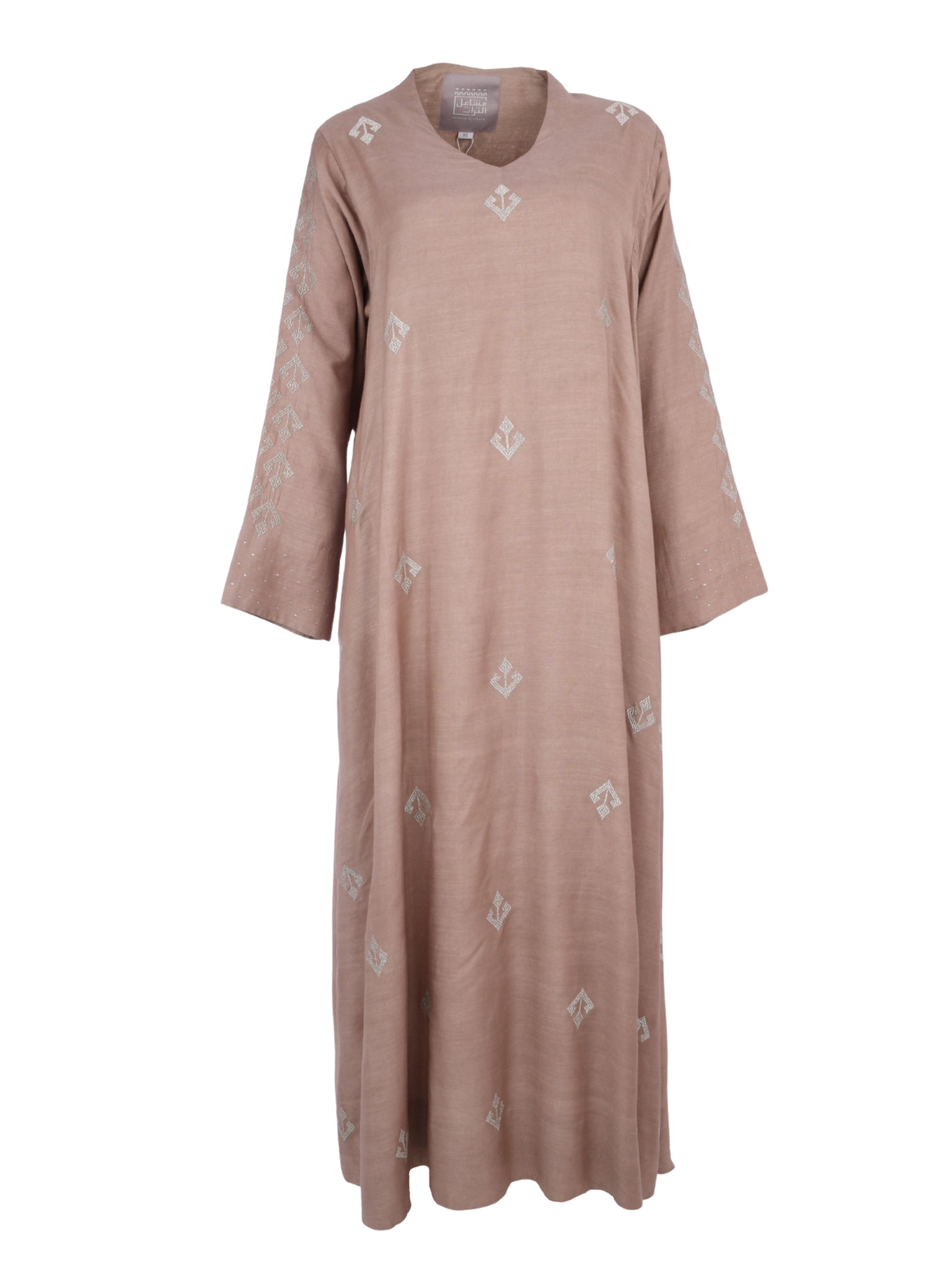 An elegant A-line cotton-silk design by MESHAEL ALTORATH, crafted to reflect effortless sophistication. The soft beige tone and fluid silhouette create a timeless piece that embodies contemporary Saudi luxury.