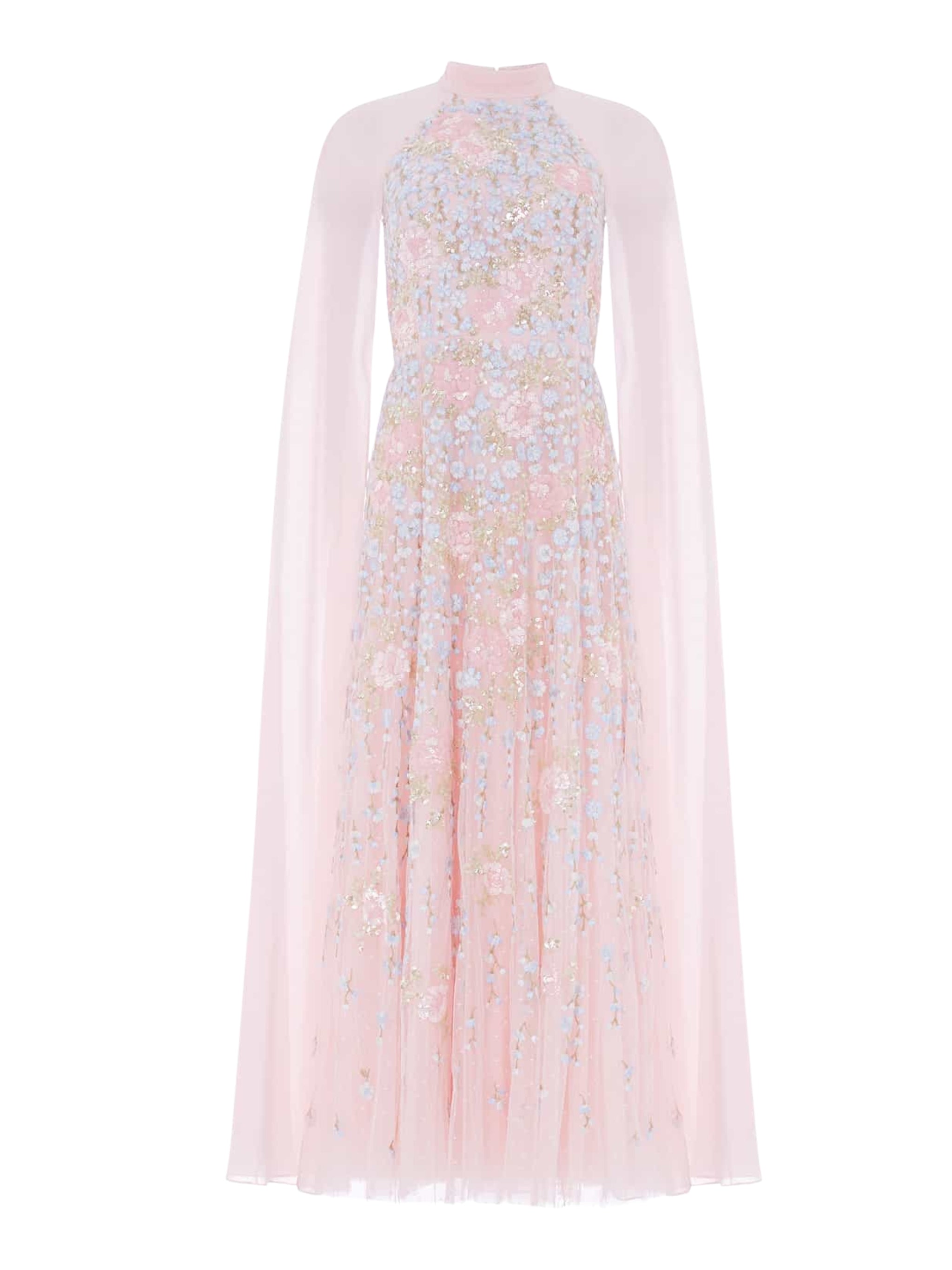 Romantic and ethereal, the Cressida Floral Cape Ankle Gown by NEEDLE & THREAD in soft pink features exquisite floral embroidery and a delicate chiffon cape, perfect for weddings and formal events in Saudi Arabia.