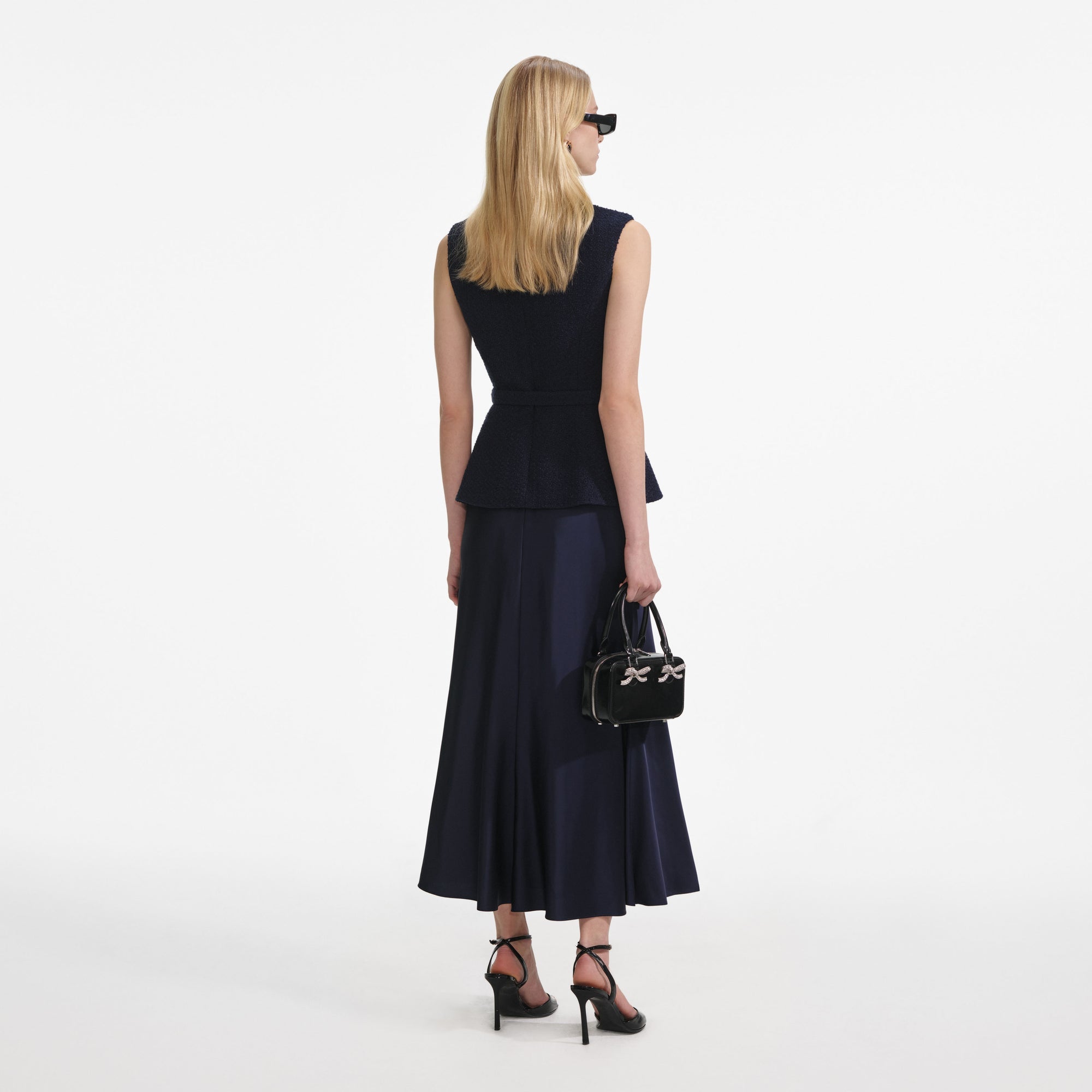 Structured navy bouclé with satin accents for a luxe finish