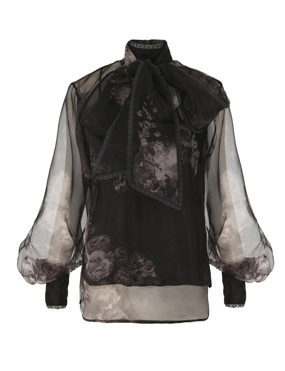 Make a sophisticated statement with the Hypnotic Pussybow Blouse in Ghost Floral by Zimmermann. Crafted from delicate silk organza, this sheer blouse features an exaggerated self-tie pussybow, romantic lace trims, and blouson sleeves with dramatic elongated cuffs perfect for elevated daywear or refined evening occasions.