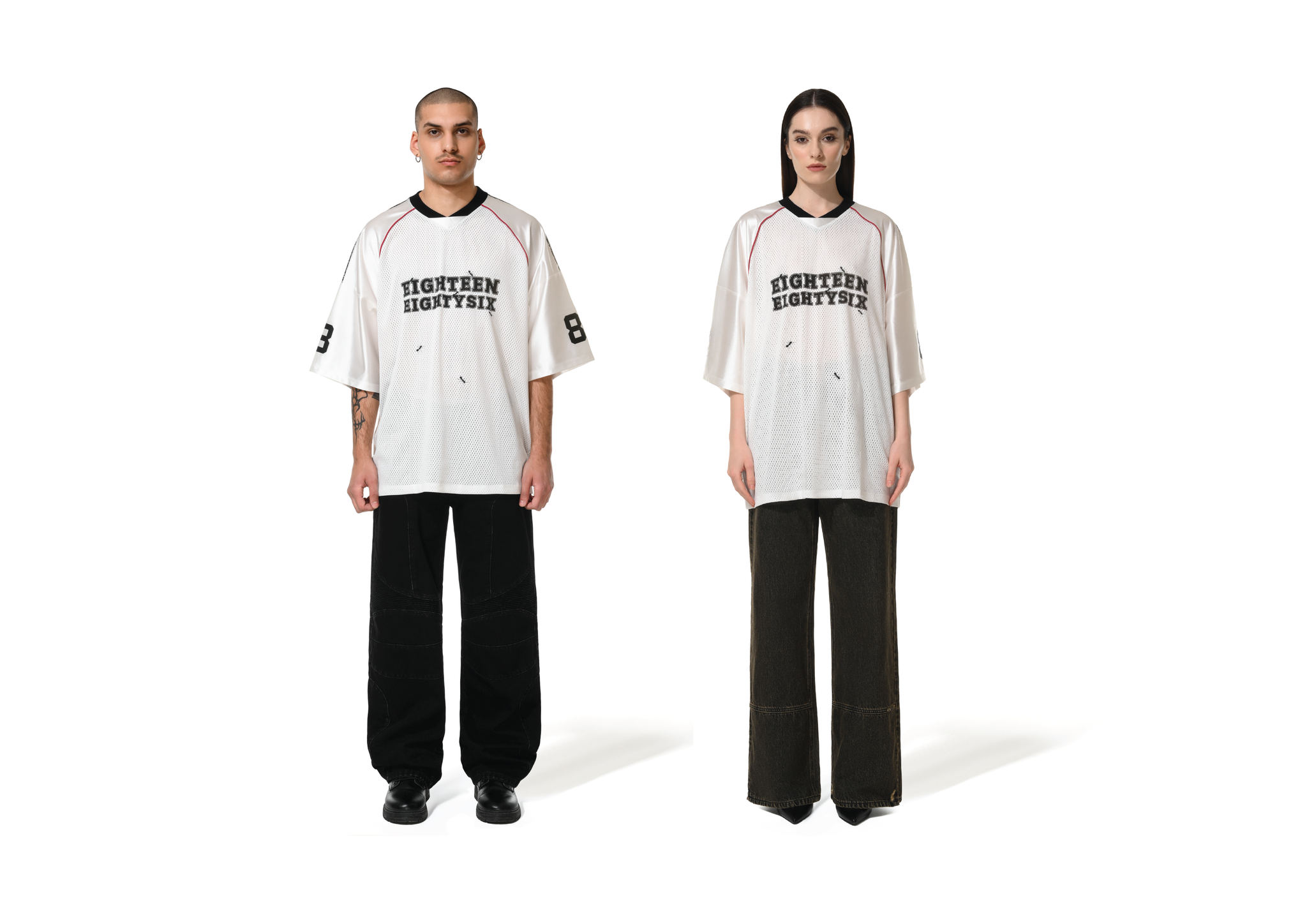 Elevate your casual wardrobe with this oversized jersey, designed for effortless street-ready style. Featuring the bold "Eighteen Eighty Six" logo on the front and distinctive prints on the sleeves and back, this piece blends comfort with standout urban aesthetics. Its loose, relaxed fit offers ease of movement while making a strong style statement.