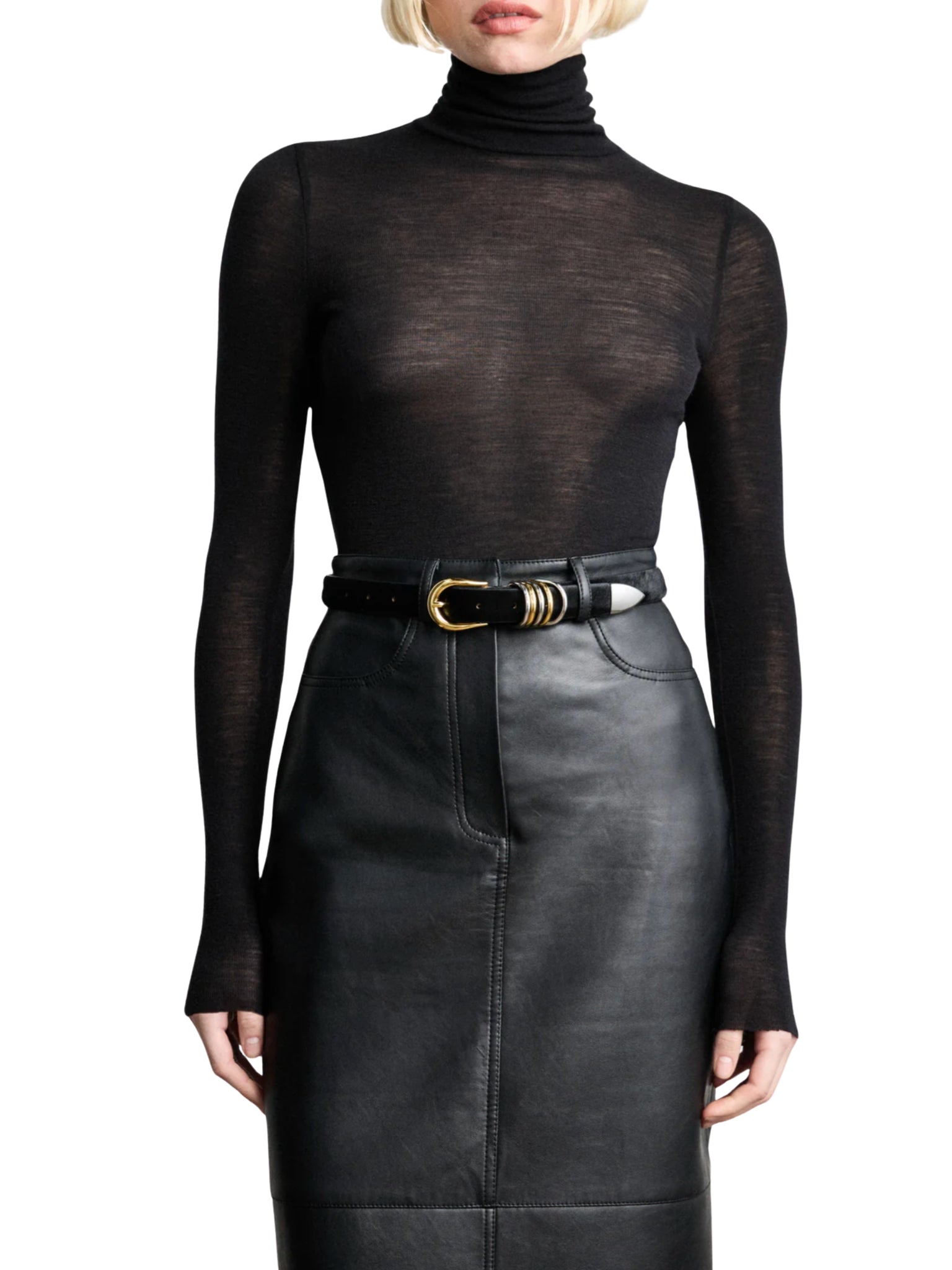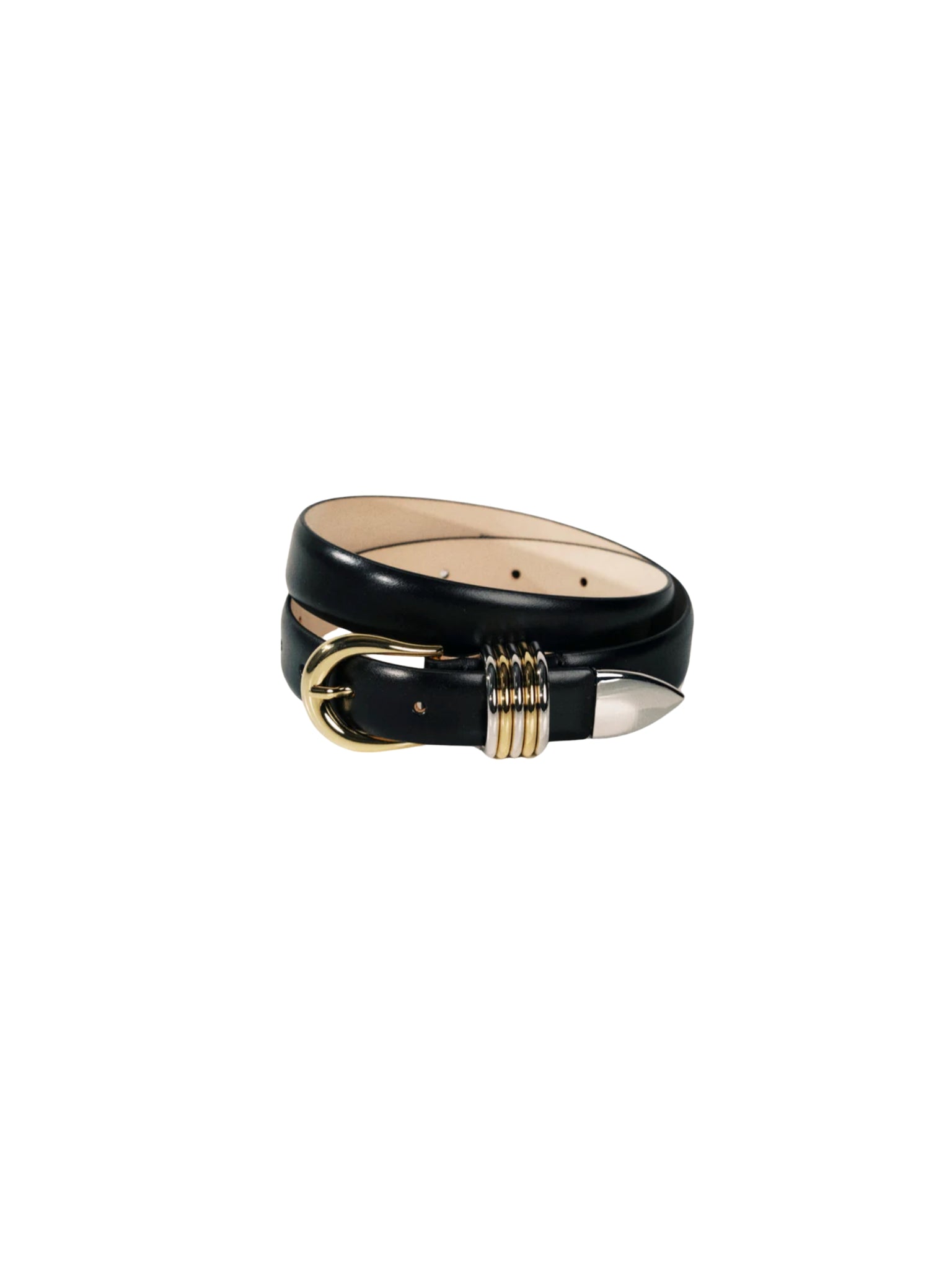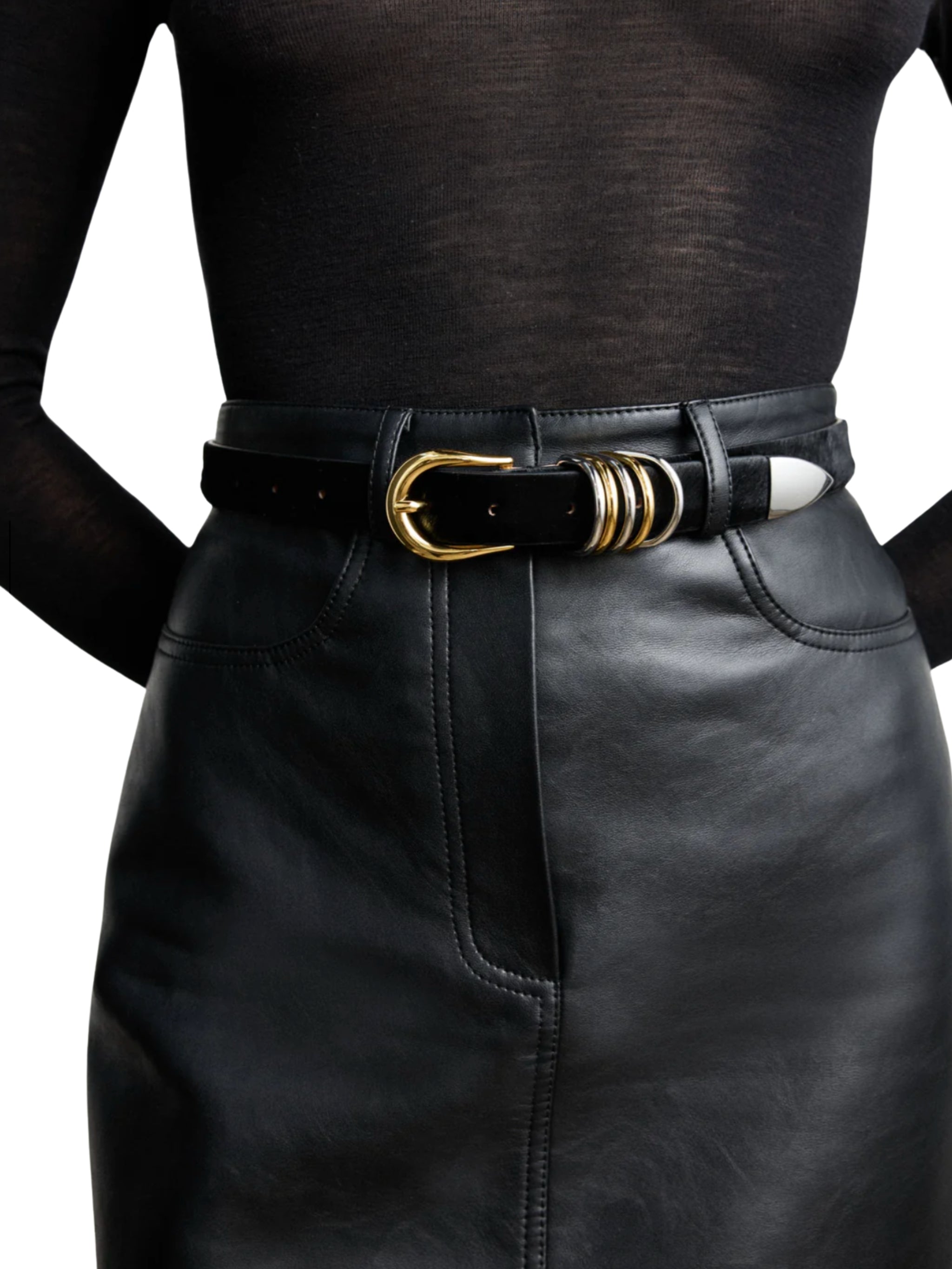 An elevated version of DEHANCHE’s iconic debut style, the Hollyhock Mixed Metal Belt introduces a unique contrast of silver and 24K gold-finished hardware. Crafted in Italy from smooth calfskin leather, this statement piece blends classic form with a modern edge—designed to complement everything from sleek abayas to structured tailoring. The 10-hole signature fit and five gleaming rings create a polished, sculptural silhouette that defines the waist with subtle sophistication.