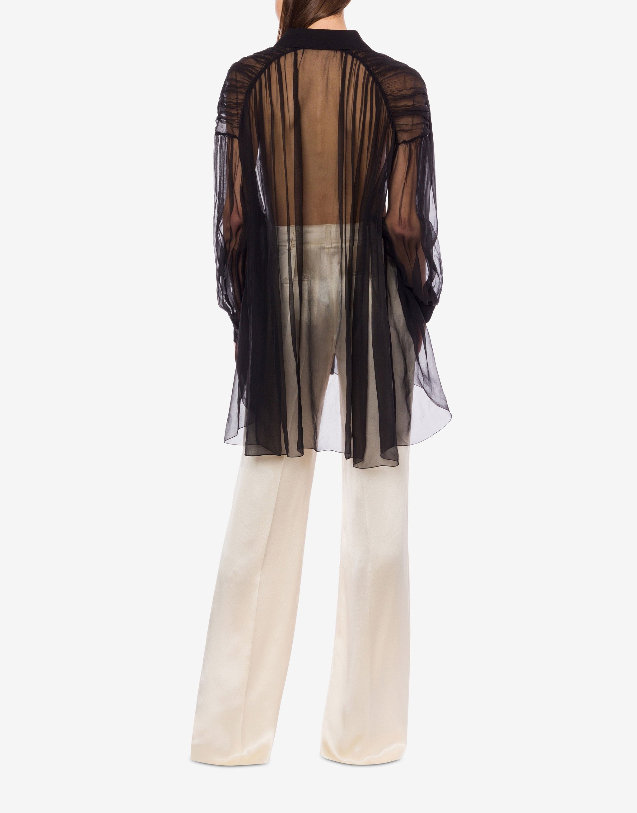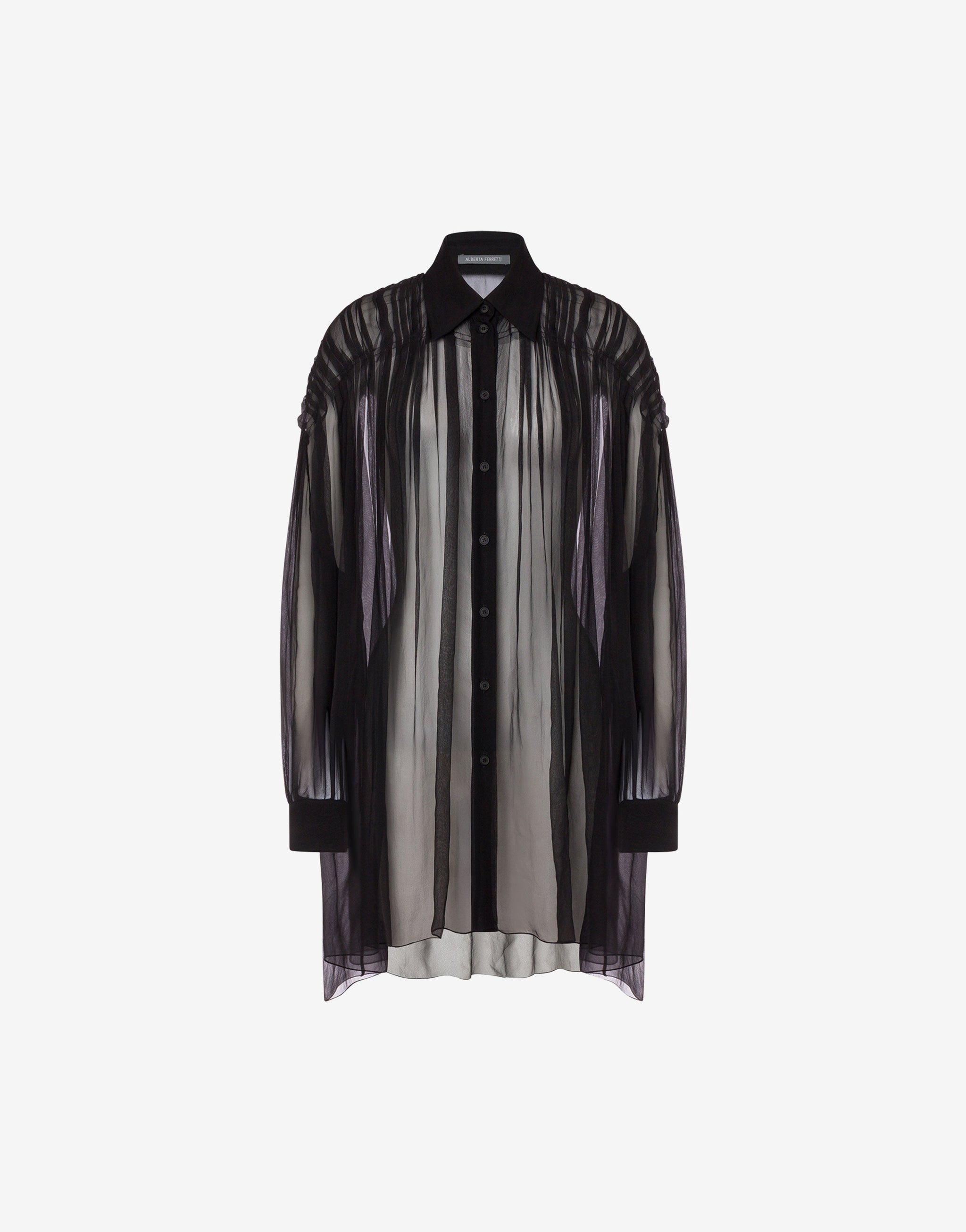 Light as air and effortlessly sophisticated, this black chiffon shirt is crafted from organic silk with a crisp finish and gentle ruching. Its delicate pleats and flowing fit offer timeless elegance with modern ease—perfect for elevated daywear or understated evening looks.