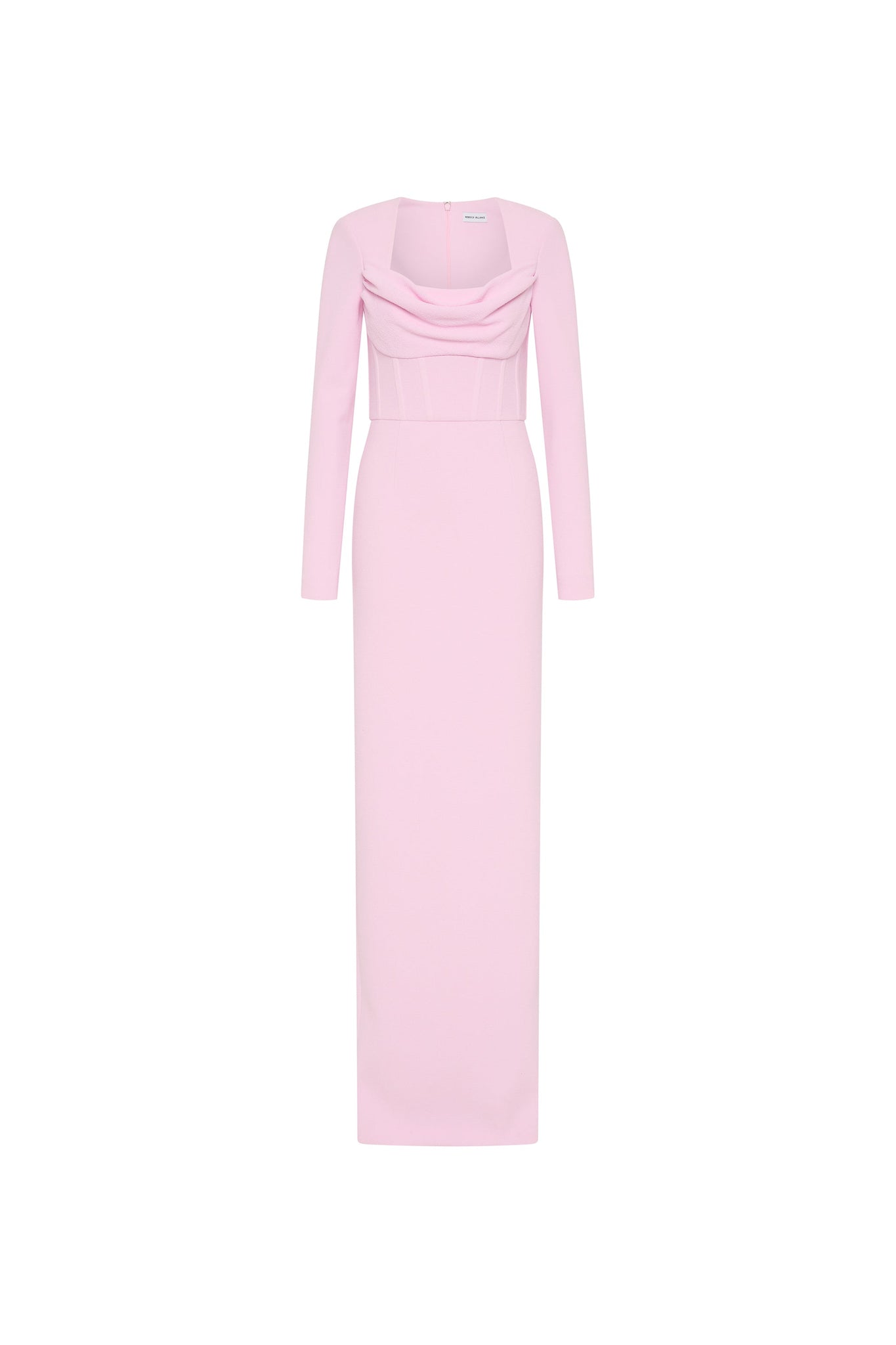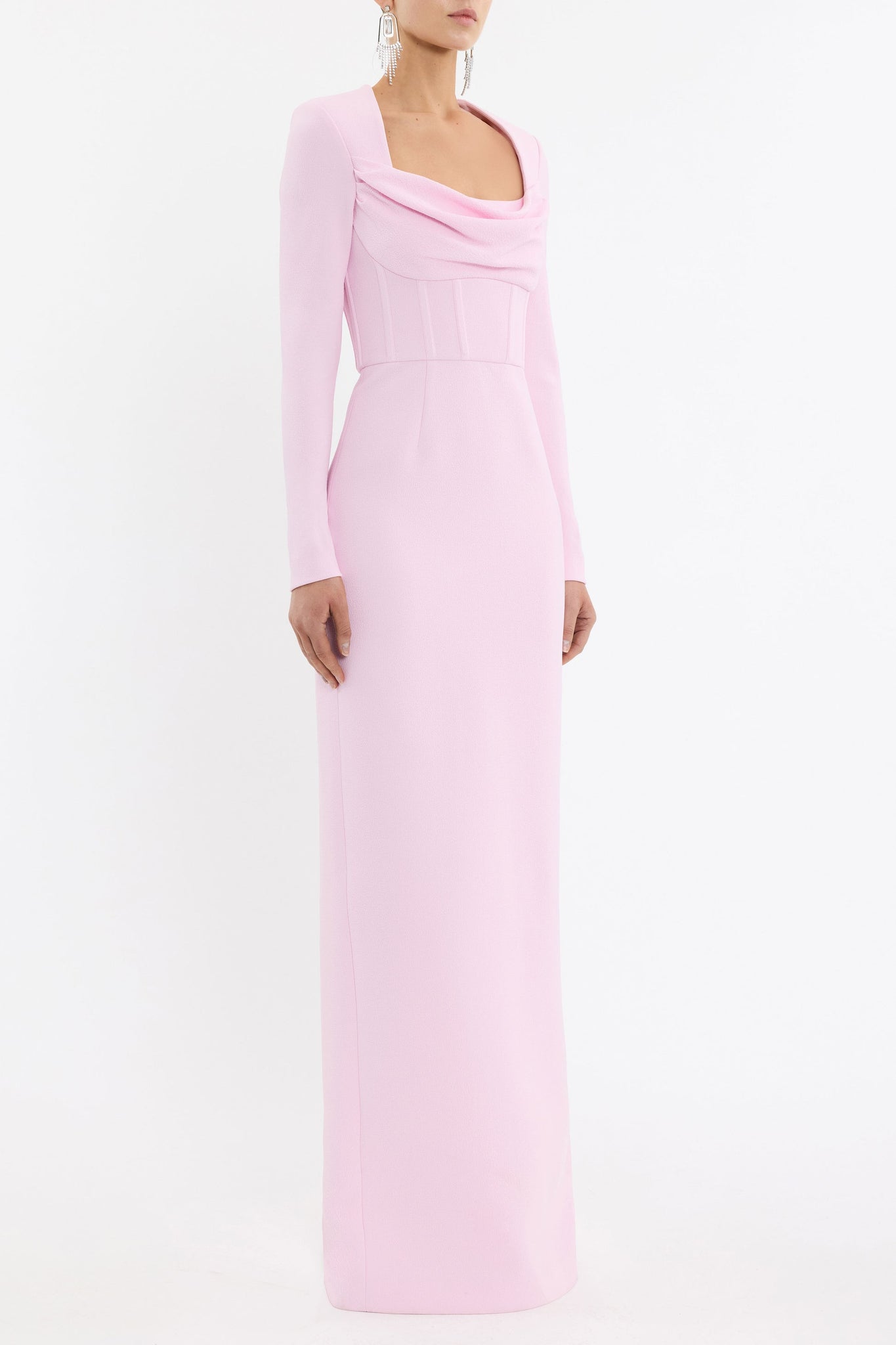 Embrace timeless sophistication with the Nemy Gown by Rebecca Vallance. Crafted from bonded crepe in a graceful pink hue, this gown showcases a draped cowl neckline and long sleeves that flow seamlessly into a structured, boned bodice. Cinched at the waist to accentuate the feminine form, the column maxi skirt with a subtle back split offers refined movement a perfect choice for formal evenings, galas, or weddings in Saudi Arabia.