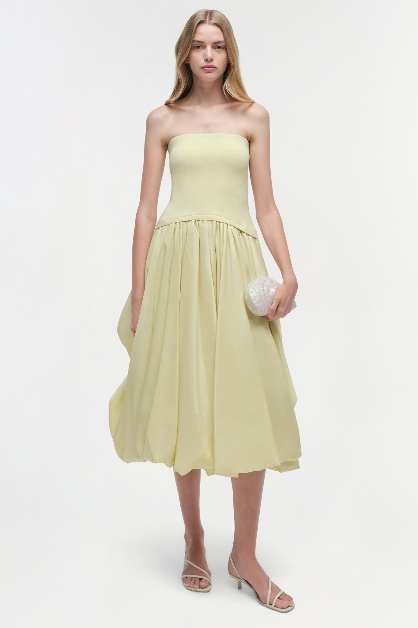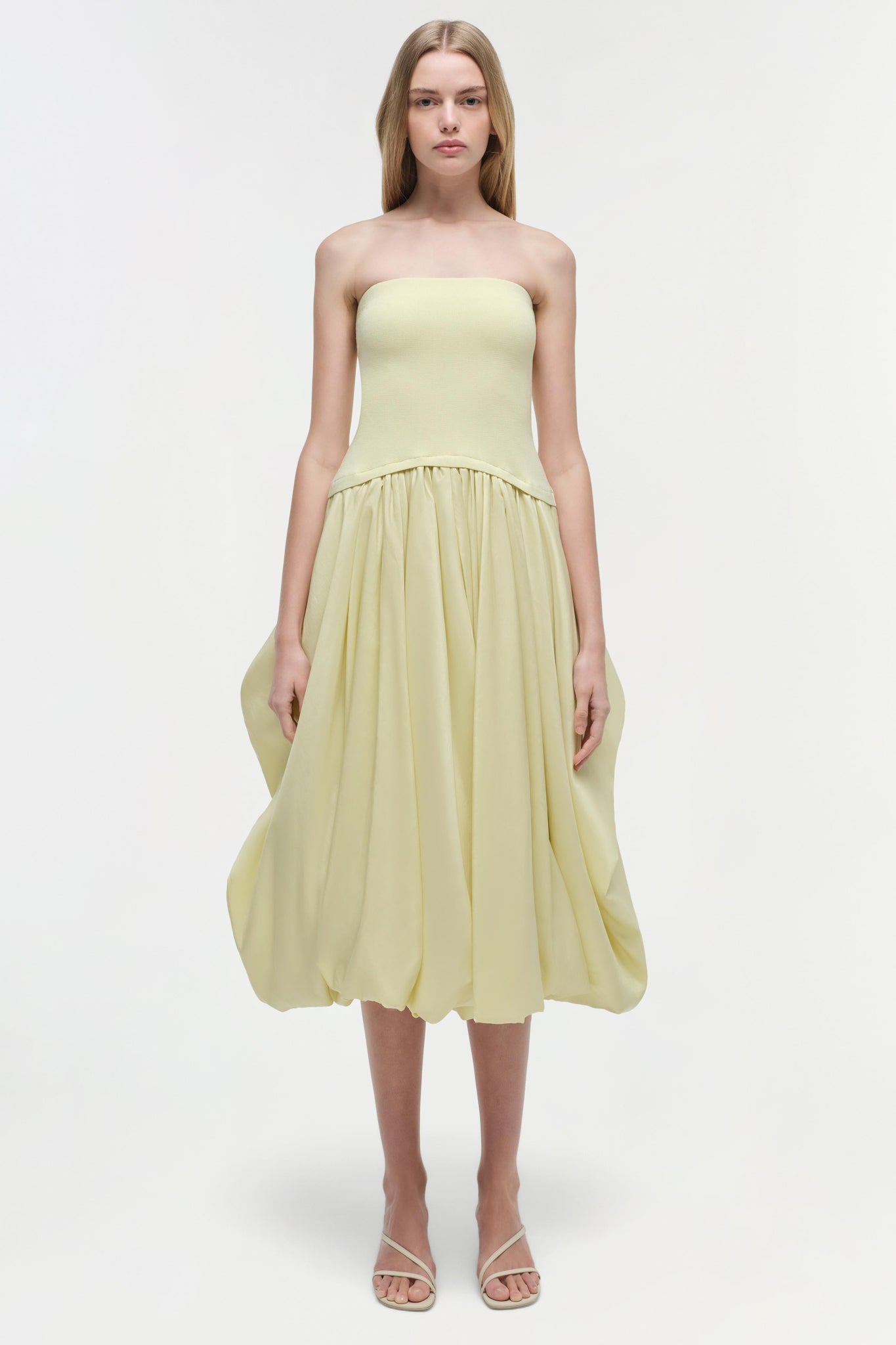 Step into effortless sophistication with the Izzy Strapless Taffeta Midi Dress in radiant Sunglow. This mixed-media piece pairs a knit bustier top with a voluminous taffeta skirt, artfully gathered at the sides for a fashion-forward silhouette. The perfect blend of structure and softness.