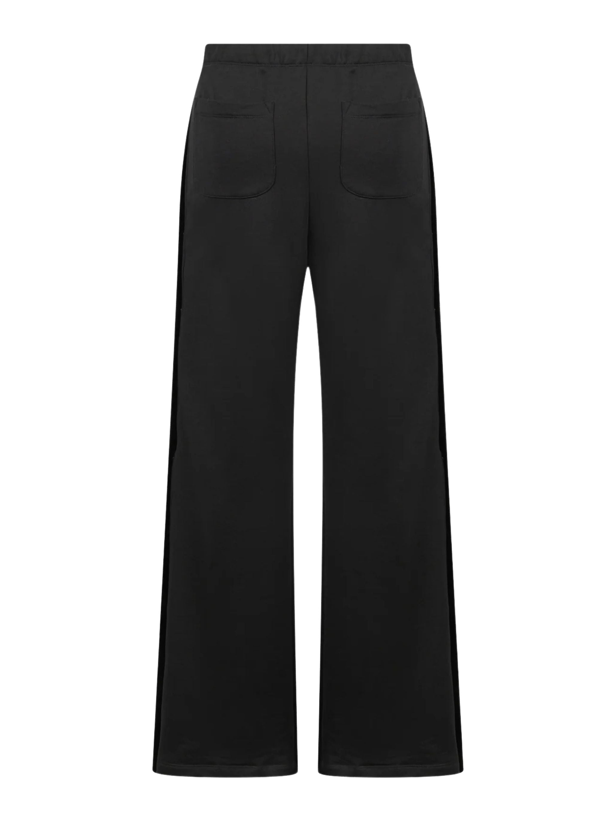 • Wide-leg black sweatpants with adjustable drawstring waist