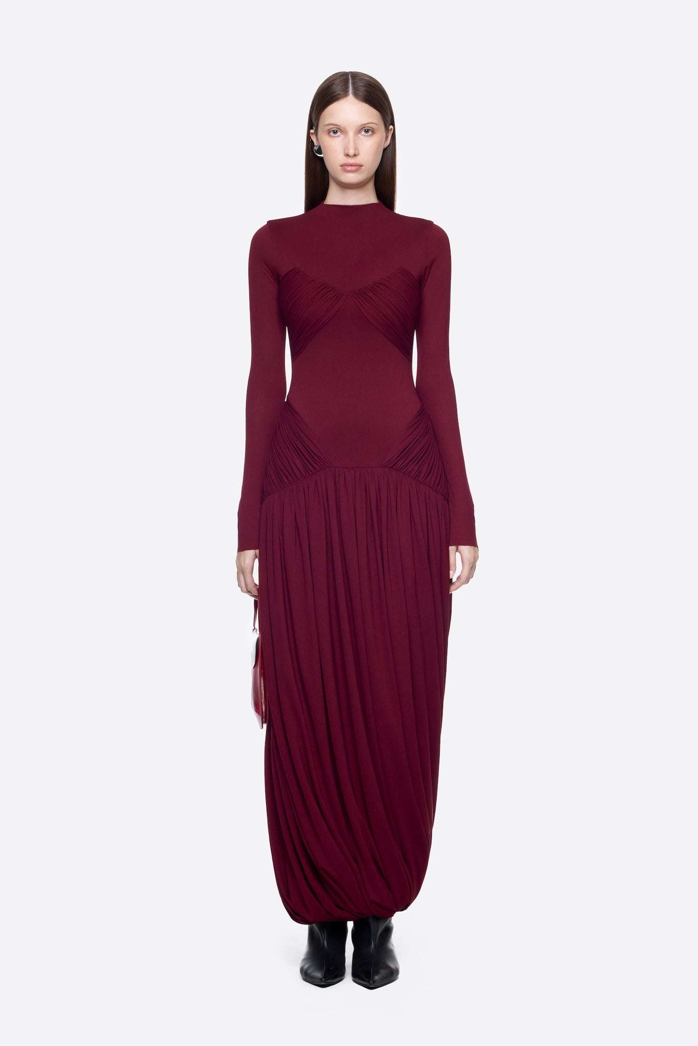 Sophisticated and sculptural, the Torin Dress in vibrant red is designed to highlight elegance and modern femininity. Its waist-cinched silhouette, symmetrical draped bust and hip, and circular twisted skirt create a flattering, statement-making look perfect for evening occasions in Saudi Arabia.