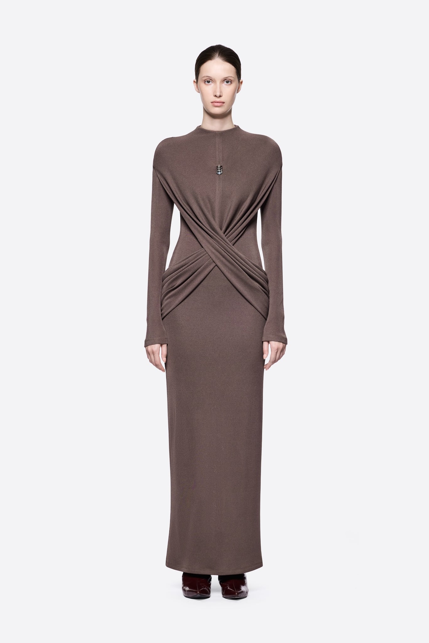 Elegant and contemporary, the Azora Dress in rich brown is designed to make a sophisticated statement. Its form-fitting silhouette, diagonal draping, and subtle metallic detail create a refined, modern look perfect for evening occasions in Saudi Arabia.
