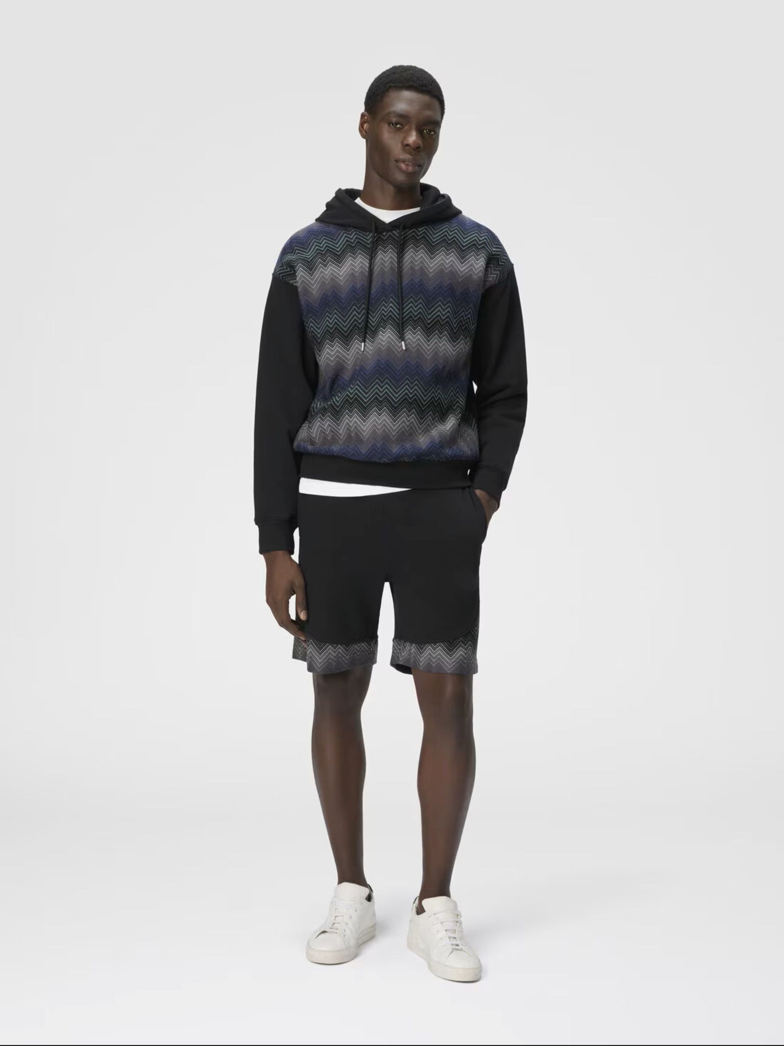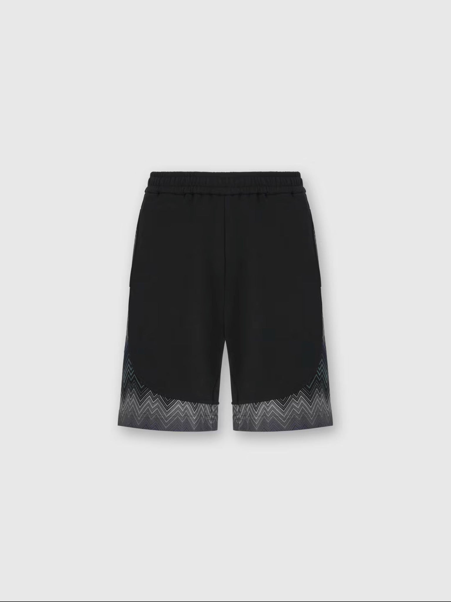 Men’s cotton fleece shorts with a contemporary twist, featuring Missoni’s signature zigzag motif in raschel-worked inserts. These shorts blend casual comfort with the maison’s distinctive elegance, making them perfect for refined summer styling.