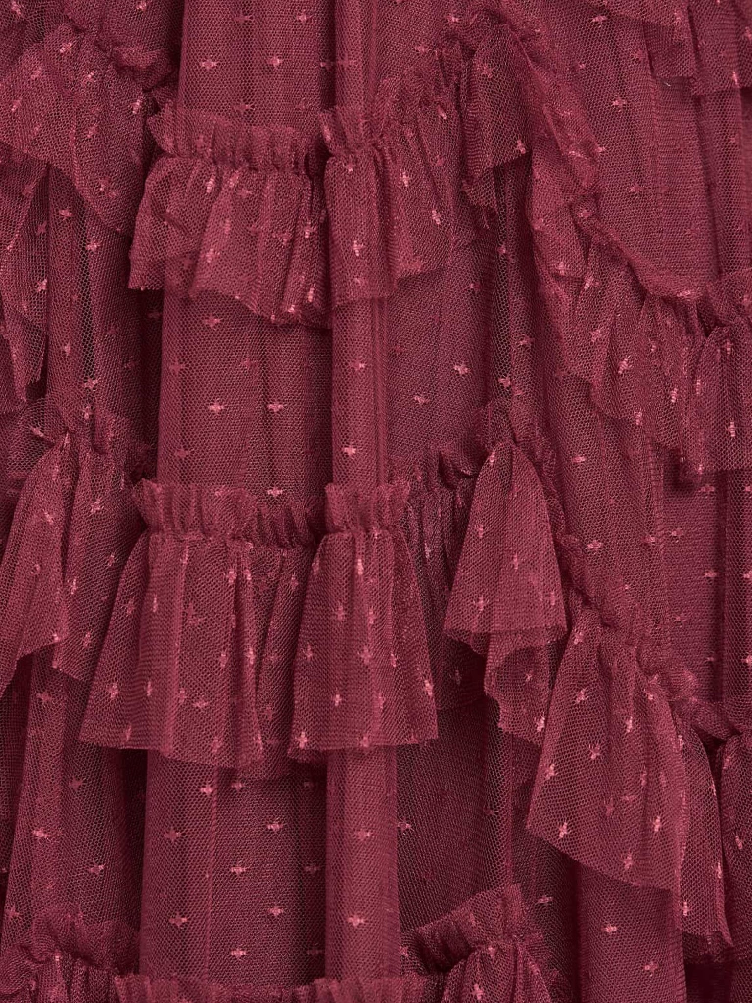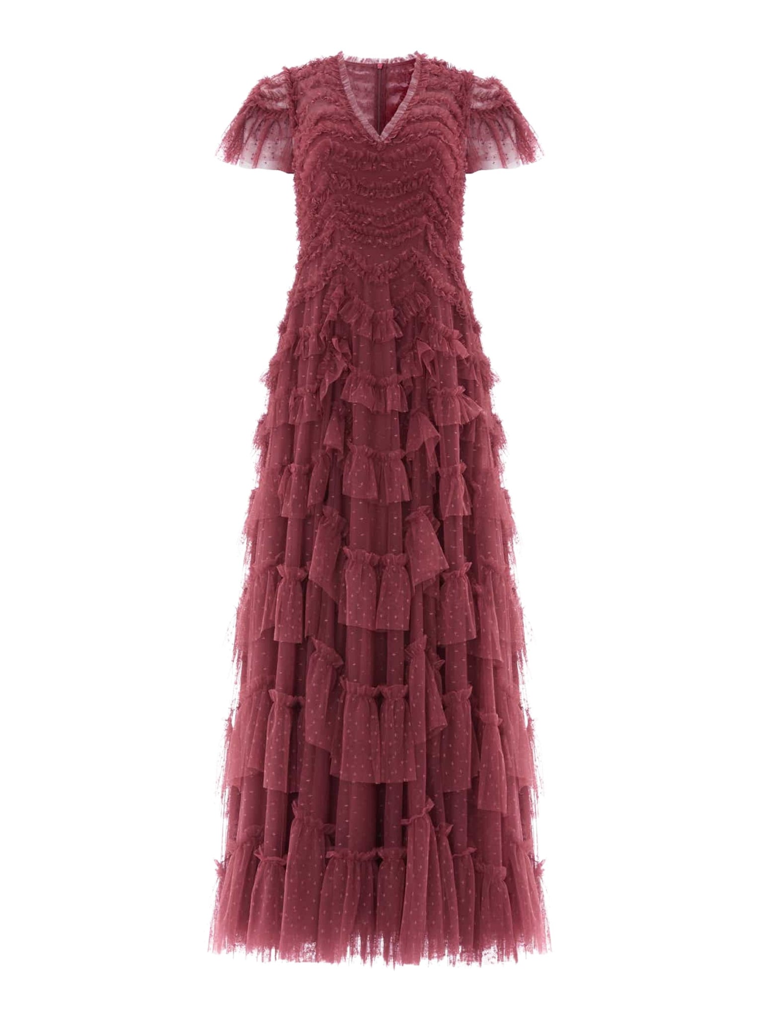 The Aviana V-Neck Gown in Winterberry embodies romance and refined drama. Crafted in layers of deep berry tulle, cascading scalloped frills create fluid movement with every step. The elegant V-neckline brings a modern balance to the gown’s soft, textured construction a captivating choice for festive evenings and special celebrations.