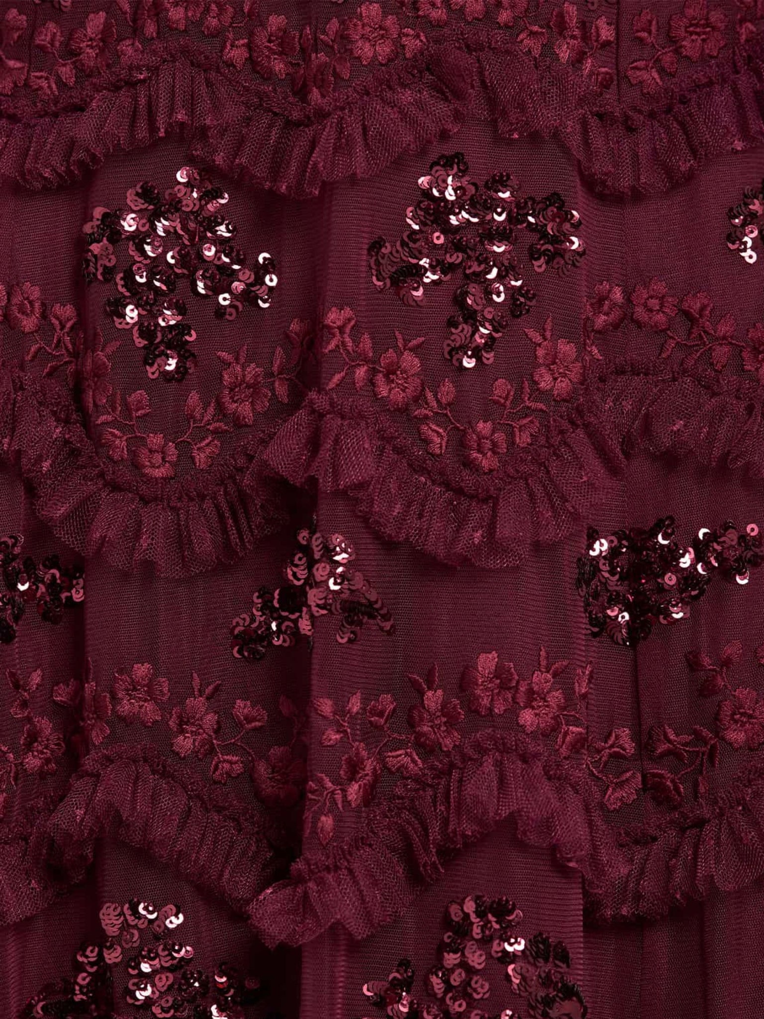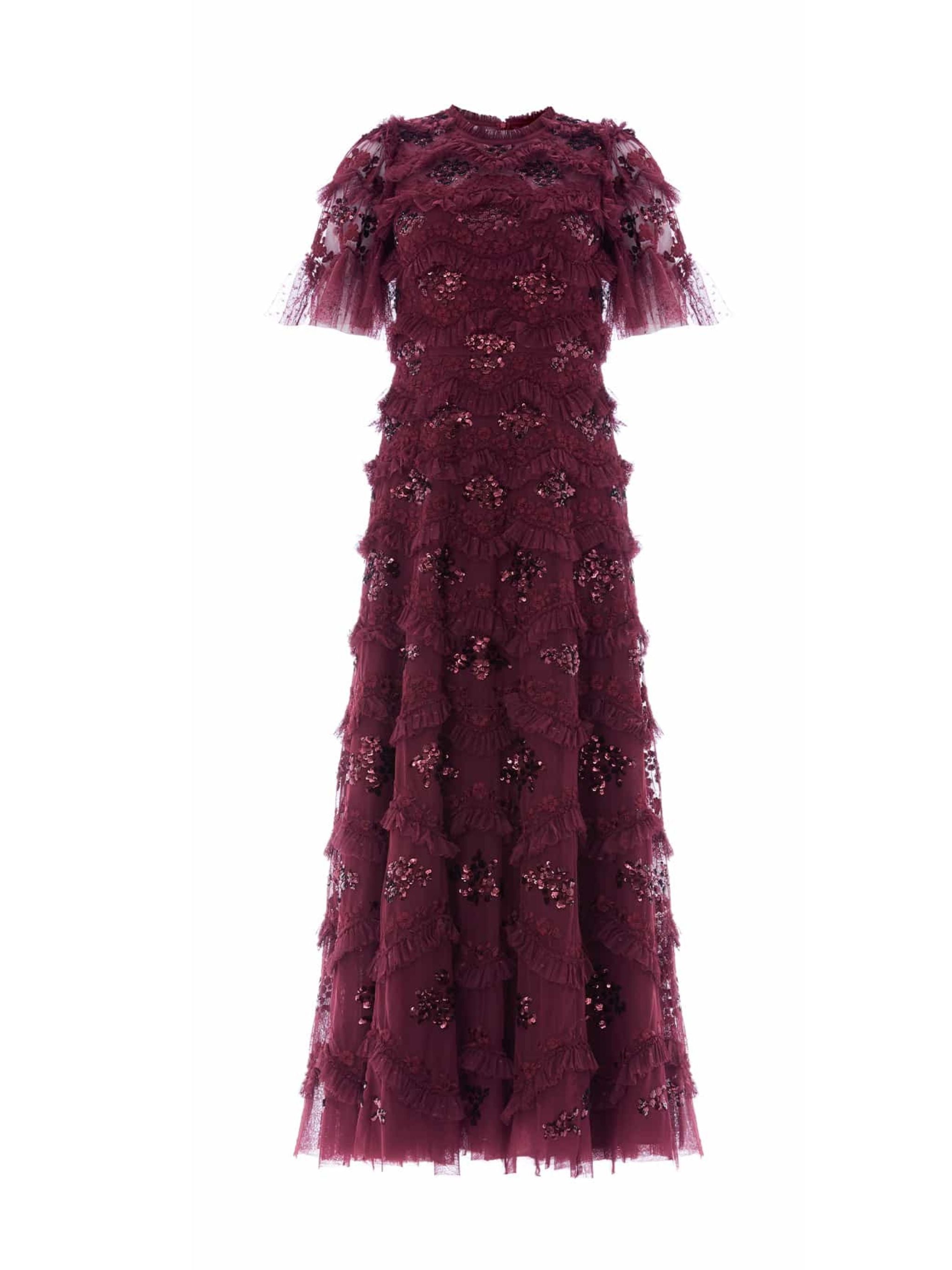 The Daisy Wave Ankle Gown in Claret captures bold femininity through intricate texture and radiant detail. Crafted from layers of delicate tulle, the gown is beautifully adorned with undulating daisy sequin motifs that shimmer with every movement. The deep claret tone enhances its romantic allure a captivating choice for evening events and special occasions.