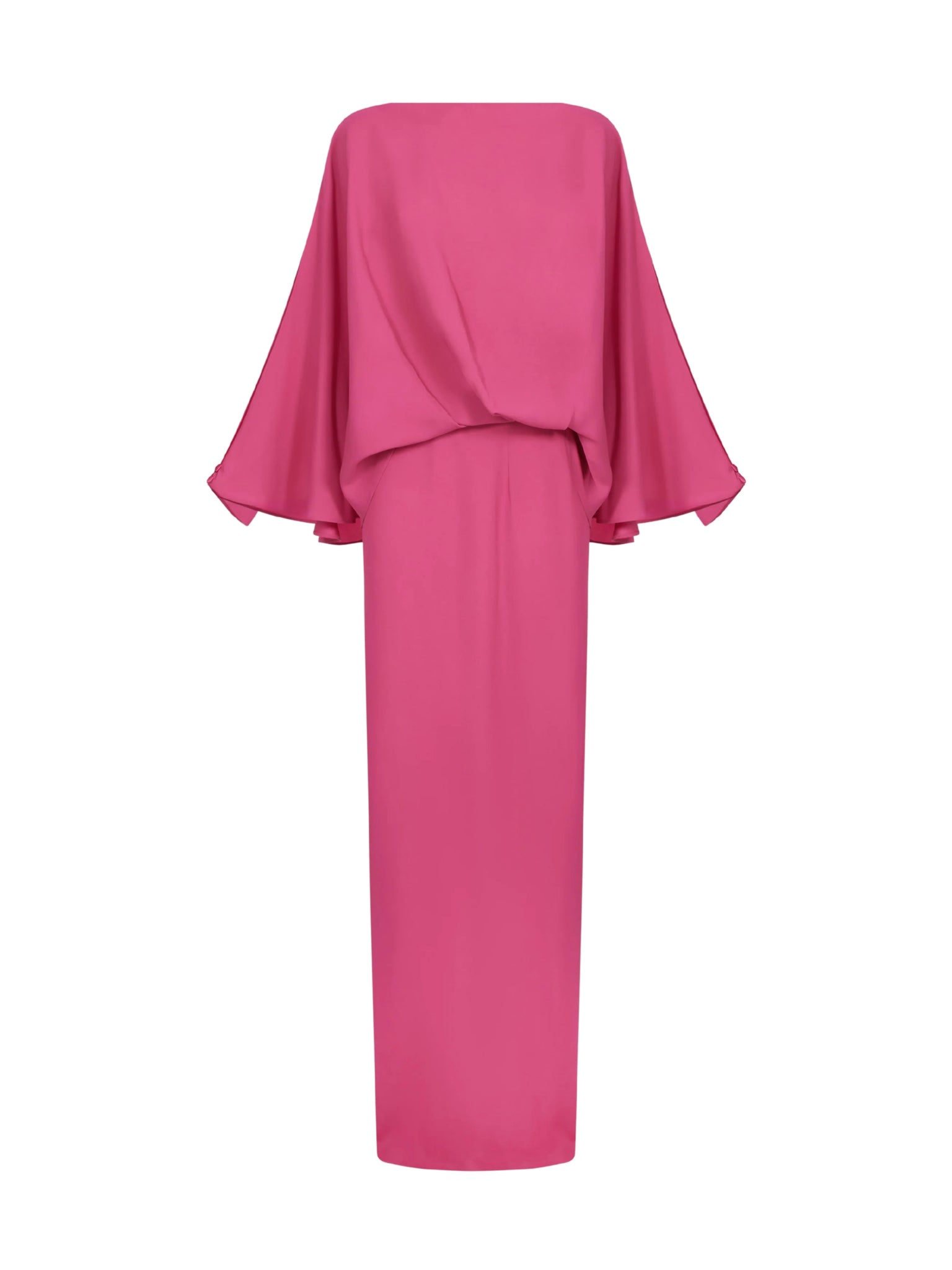 Crafted from fluid viscose-blend crepe cady, the La Maddalena Dress embodies elegance with a contemporary edge. The design contrasts a draped, oversized blouson top with a sleek floor-length column skirt for a refined silhouette. Open sleeves with delicate wrist cuffs enhance movement and sophistication, creating a perfect balance of grace and modernity.