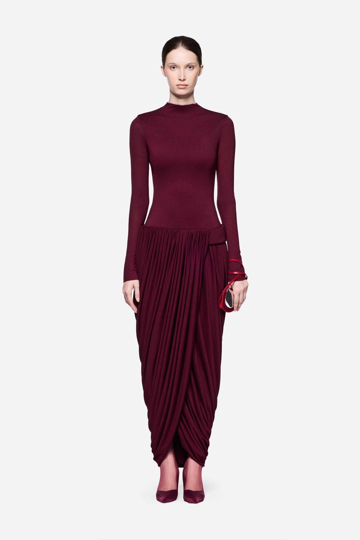 Elegant and modern, the Agnes Dress in vibrant red combines sculptural design with a flattering silhouette. Its long sleeves, twisted skirt, and pumped waistband create a refined, statement-making look perfect for evening occasions in Saudi Arabia.