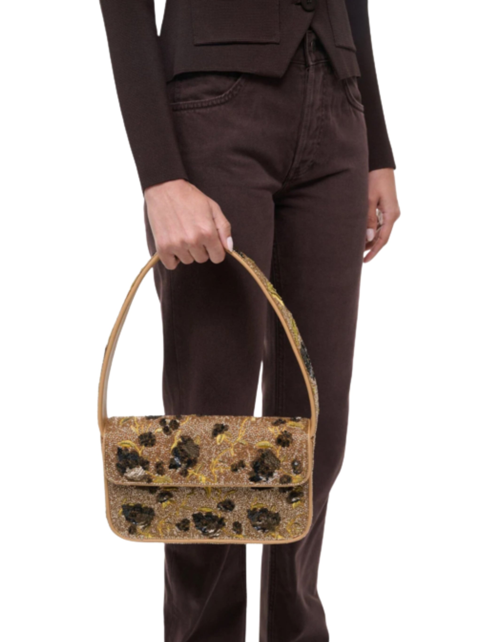 Statement-making and luxuriously textured, the Tommy Beaded Bag from Staud elevates any outfit with its intricate craftsmanship. Covered in sparkling glass beads, this designer bag blends playful glamour with modern minimalism. Perfect for curated evening looks, luxury daywear, or special occasions in Saudi Arabia, it adds a refined, high-fashion touch to any ensemble.