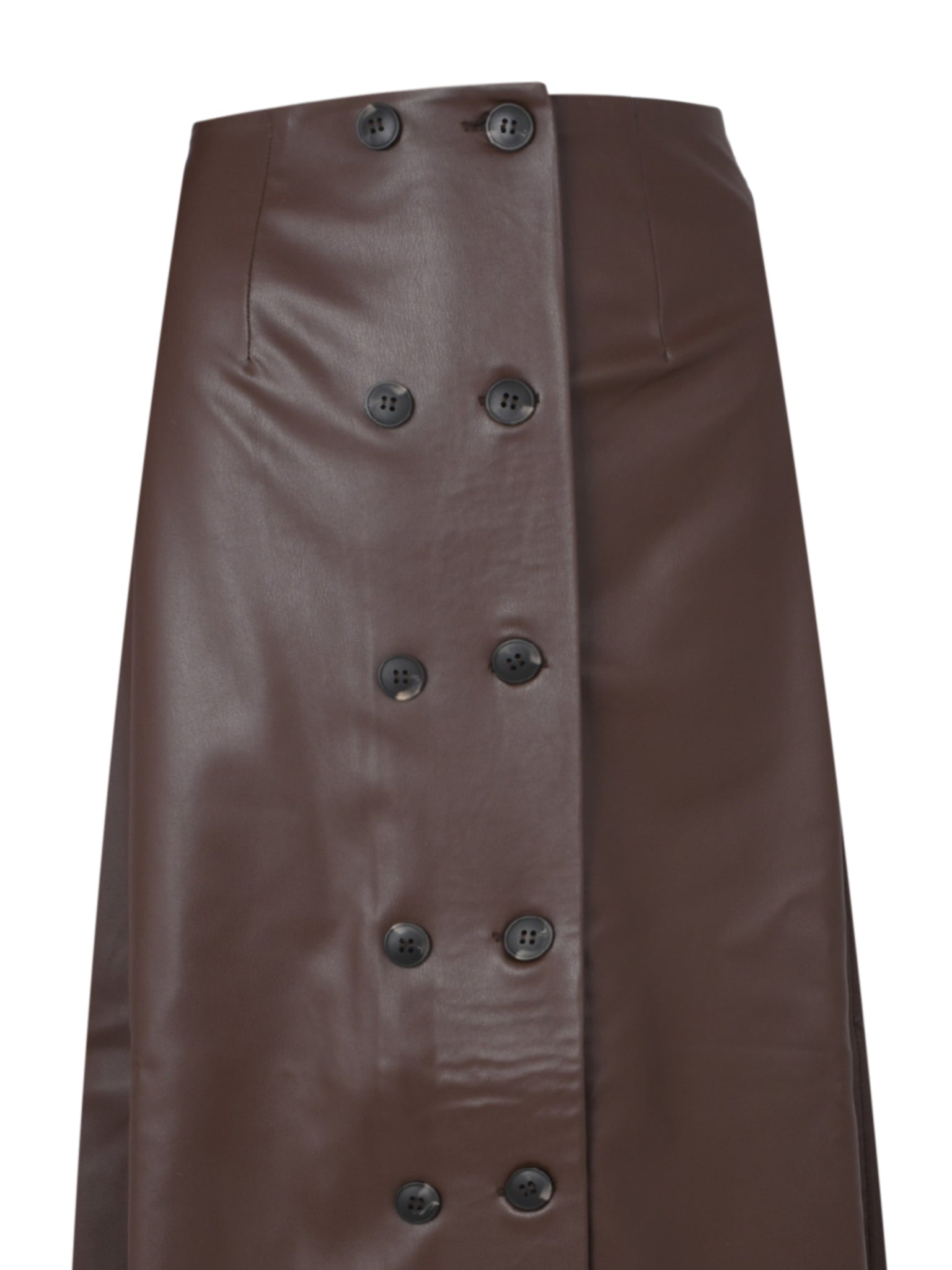 BROWN VEGAN LEATHER BUTTON-DETAIL MIDI SKIRT