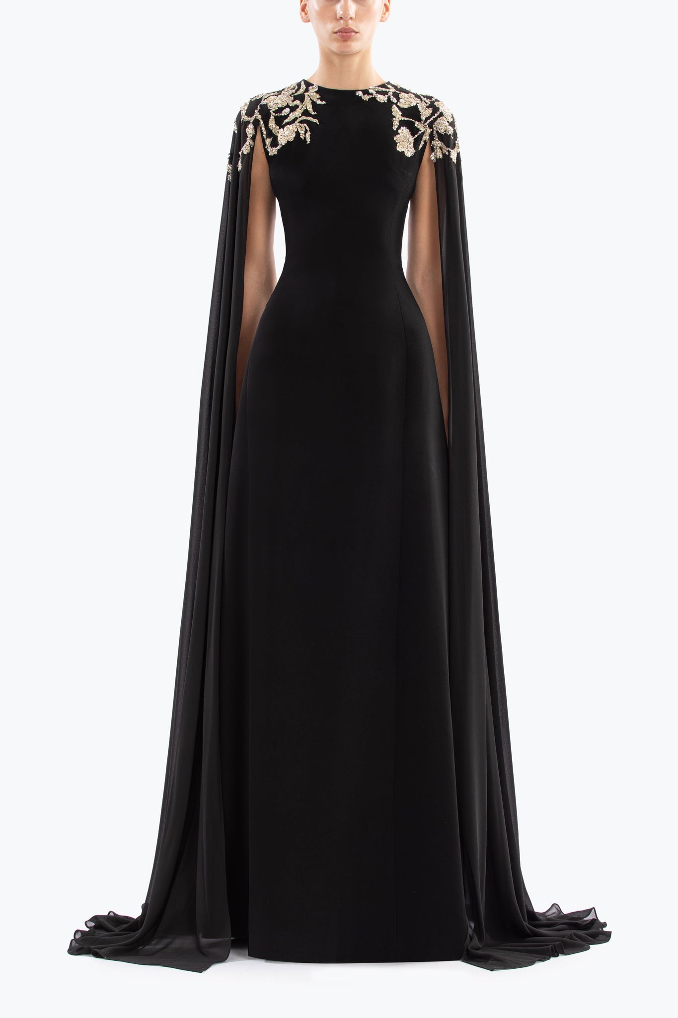 Command attention in this jet black embellished crepe kaftan, featuring a flowing georgette cape and luxurious gold floral embroidery for a timeless and regal look.