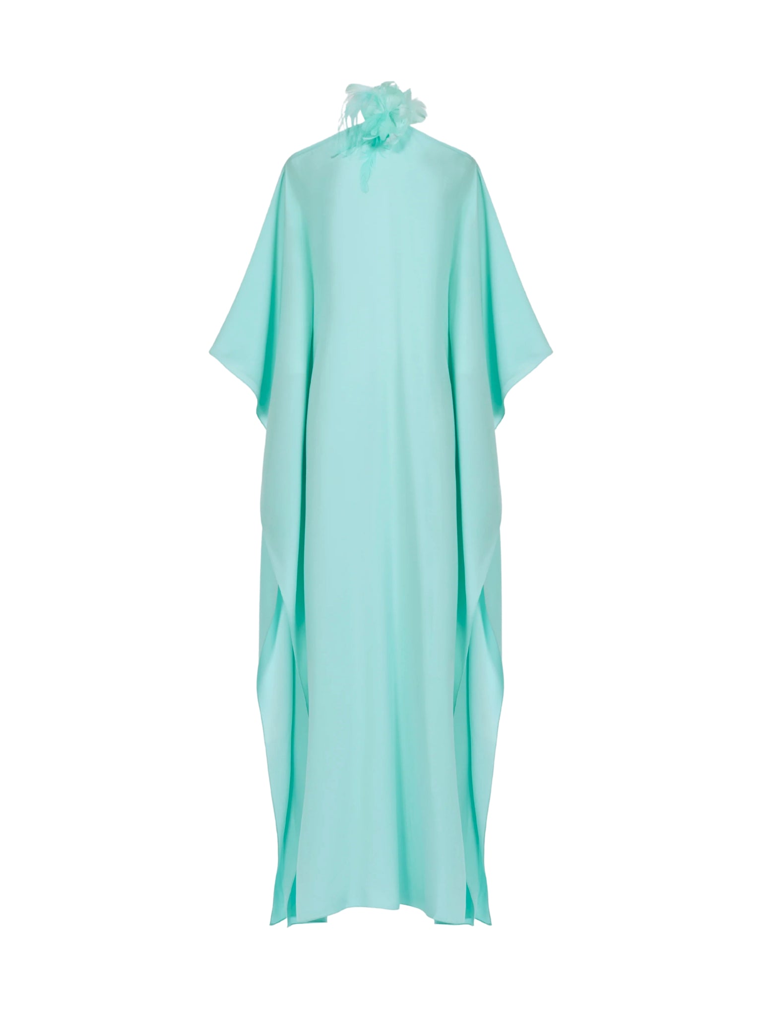 The Sza Sza Garden is a halter-neck kaftan crafted from a fluid viscose-blend crepe cady. Lightweight and elegant, the design features a choker-style necklace adorned with soft tassels and a detachable hand-crafted flower embellished with luxurious ostrich feathers. Its flowing silhouette brings effortless glamour to evening or resort occasions.