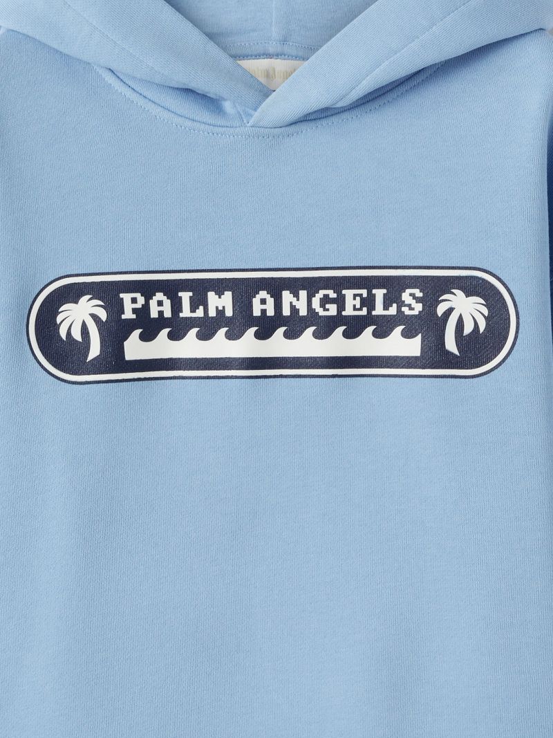 BOY'S LIGHT BLUE HOODIE WITH PALM ANGELS LETTERING, WAVES AND PALM TREE PATTERN SCREEN-PRINTED IN WHITE ON BLUE FRONTSIDE.
