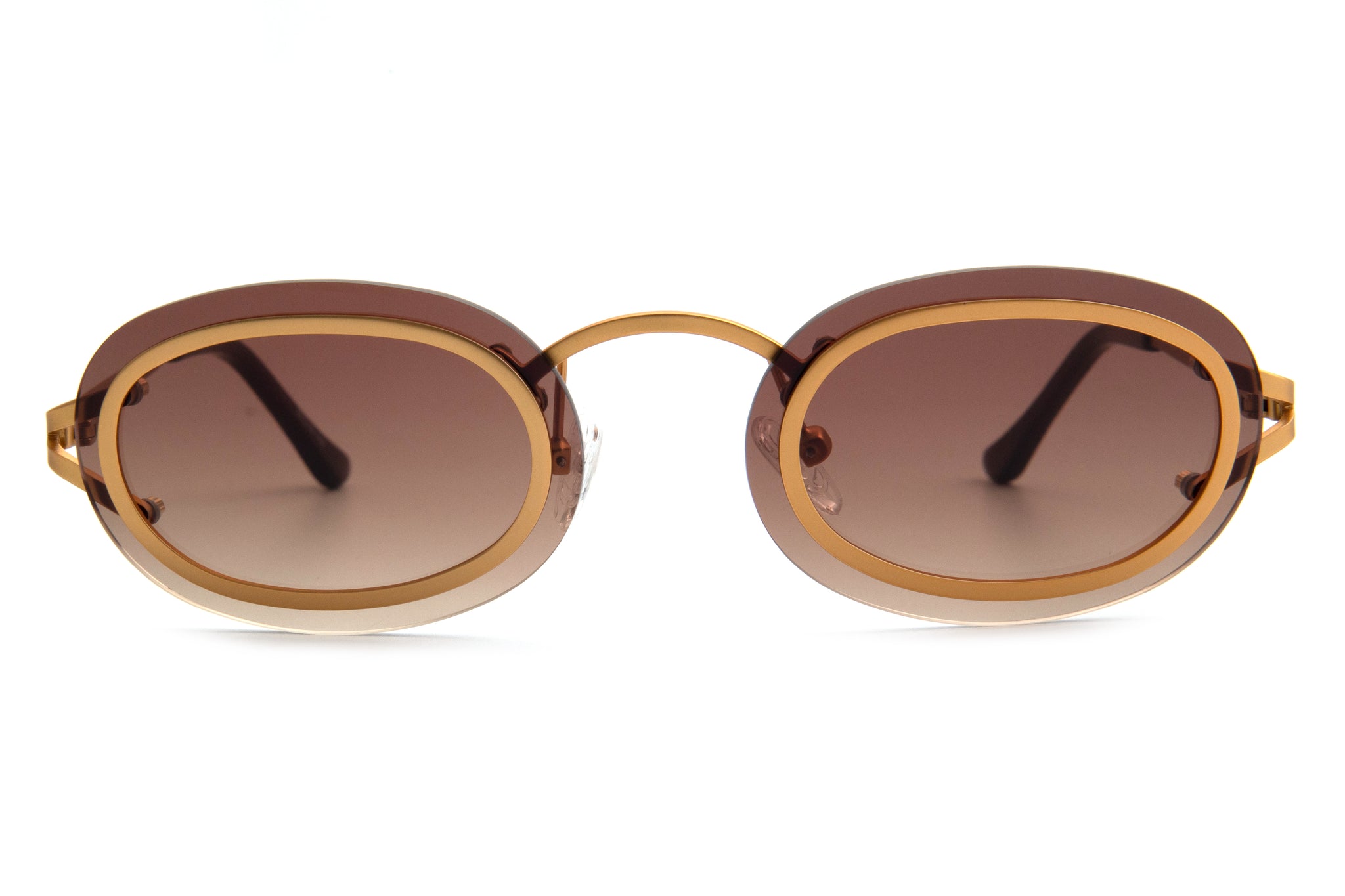 Gold-tone frame paired with warm brown lenses for a sophisticated contrast